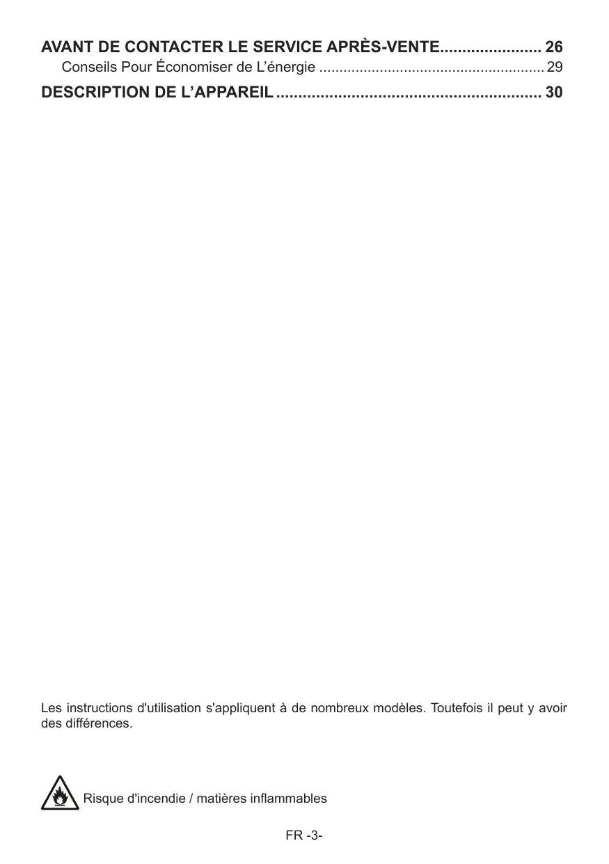 MISE EN GARDE: Ne pas utiliser d'appareils électriques à l'intérieur du compartiment de stockage des denrées, à moins qu'ils ne soient du type recommandé par le fabricant. MISE EN GARDE: Ne pas endommager le circuit de réfrigération. MISE EN GARDE: Lorsque vous positionnez l'appareil, assurez-vous que le câble d'alimentation n'est pas coincé ou endommagé. MISE EN GARDE: N'installez pas plusieurs prises de courant portatives ou alimentations portatives à l'arrière de l'appareil. MISE EN GARDE: Pour éviter tout risque dû à l'instabilité de l'appareil, celui-ci doit être fixé conformément aux instructions suivantes : Si votre appareil utilise le R600a comme réfrigérant (cette information est indiquée sur l’étiquette du réfrigérateur), veiller à éviter d’endommager les éléments du réfrigérateur lors de son transport et de son installation. Le R600a est un gaz naturel respectueux de l’environnement, mais il est explosif. En cas de fuite résultant d’un dommage occasionné aux éléments du réfrigérateur, déplacer ce dernier afin de l’éloigner de toute flamme nue ou source de chaleur et aérer la pièce où se trouve l’appareil pendant quelques minutes. FR -4-