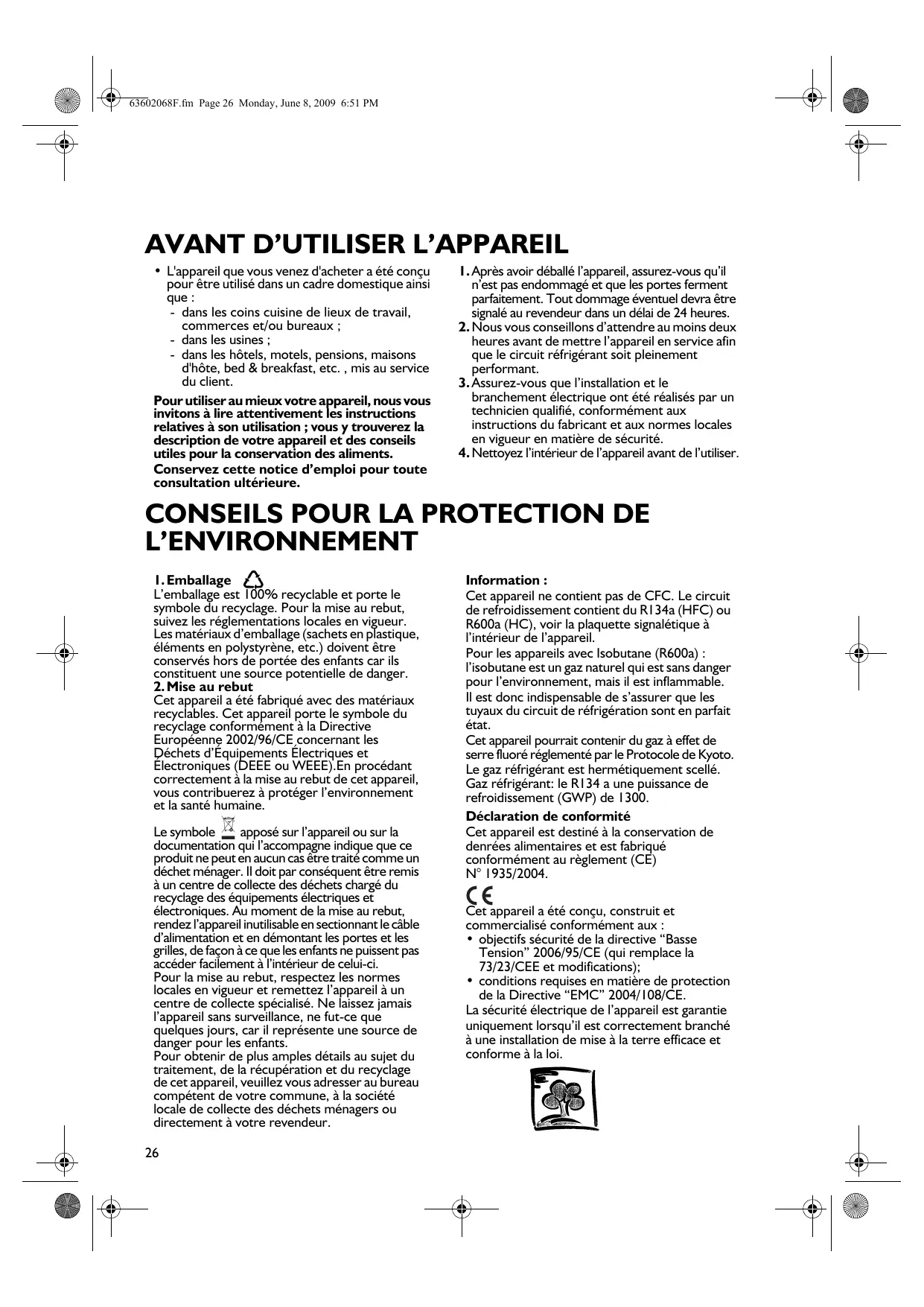 Cet appareil ne contient pas de CFC. Le circuit de refroidissement contient du R134a (HFC) ou R600a (HC), voir la plaquette signalétique à l’intérieur de l’appareil. Pour les appareils avec Isobutane (R600a) : l’isobutane est un gaz naturel qui est sans danger pour l’environnement, mais il est inflammable. Il est donc indispensable de s’assurer que les tuyaux du circuit de réfrigération sont en parfait état. Cet appareil pourrait contenir du gaz à effet de serre fluoré réglementé par le Protocole de Kyoto. Le gaz réfrigérant est hermétiquement scellé. Gaz réfrigérant: le R134 a une puissance de refroidissement (GWP) de 1300. Déclaration de conformité Cet appareil est destiné à la conservation de denrées alimentaires et est fabriqué conformément au règlement (CE) N° 1935/2004. Cet appareil a été conçu, construit et commercialisé conformément aux : • objectifs sécurité de la directive “Basse Tension” 2006/95/CE (qui remplace la 73/23/CEE et modifications); • conditions requises en matière de protection de la Directive “EMC” 2004/108/CE. La sécurité électrique de l’appareil est garantie uniquement lorsqu’il est correctement branché à une installation de mise à la terre efficace et conforme à la loi.