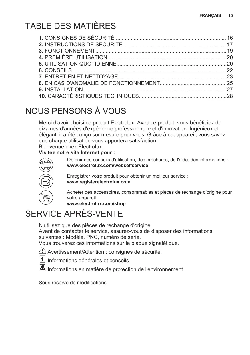 SERVICE APRÈS-VENTE N'utilisez que des pièces de rechange d'origine. Avant de contacter le service, assurez-vous de disposer des informations suivantes : Modèle, PNC, numéro de série. Vous trouverez ces informations sur la plaque signalétique. Avertissement/Attention : consignes de sécurité. Informations générales et conseils. Informations en matière de protection de l'environnement. Sous réserve de modifications.