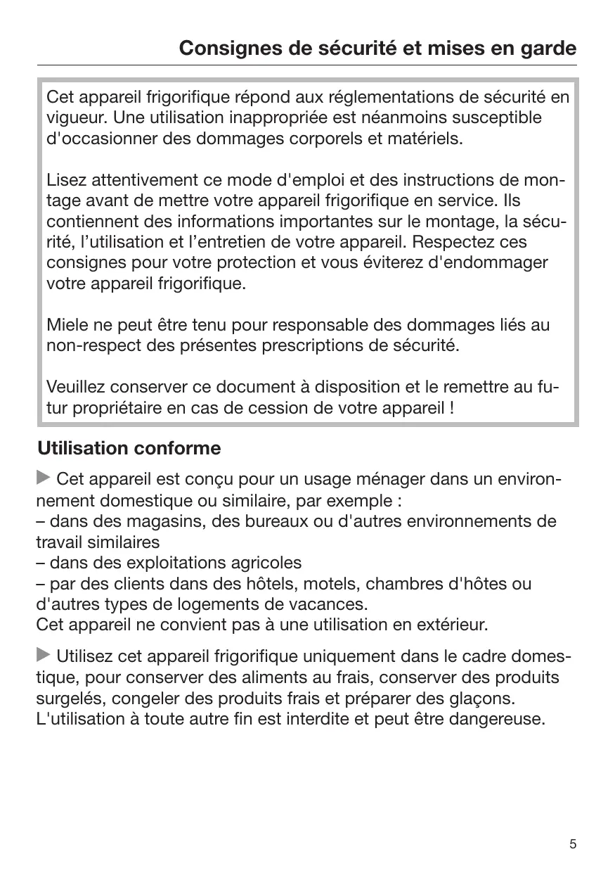 Consignes de sécurité et mises en garde Cet appareil frigorifique répond aux réglementations de sécurité en vigueur. Une utilisation inappropriée est néanmoins susceptible d'occasionner des dommages corporels et matériels. Lisez attentivement ce mode d'emploi et des instructions de montage avant de mettre votre appareil frigorifique en service. Ils contiennent des informations importantes sur le montage, la sécurité, l’utilisation et l’entretien de votre appareil. Respectez ces consignes pour votre protection et vous éviterez d'endommager votre appareil frigorifique. Miele ne peut être tenu pour responsable des dommages liés au non-respect des présentes prescriptions de sécurité. Veuillez conserver ce document à disposition et le remettre au futur propriétaire en cas de cession de votre appareil ! Utilisation conforme Cet appareil est conçu pour un usage ménager dans un environnement domestique ou similaire, par exemple : – dans des magasins, des bureaux ou d'autres environnements de travail similaires – dans des exploitations agricoles – par des clients dans des hôtels, motels, chambres d'hôtes ou d'autres types de logements de vacances. Cet appareil ne convient pas à une utilisation en extérieur. Utilisez cet appareil frigorifique uniquement dans le cadre domestique, pour conserver des aliments au frais, conserver des produits surgelés, congeler des produits frais et préparer des glaçons. L'utilisation à toute autre fin est interdite et peut être dangereuse.