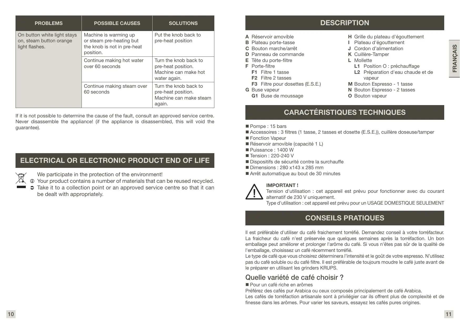 Type d'utilisation : cet appareil est prévu pour un USAGE DOMESTIQUE SEULEMENT CONSEILS PRATIQUES Il est préférable d'utiliser du café fraichement torréfié. Demandez conseil à votre torréfacteur.
