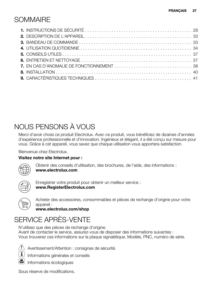 Avant de contacter le service, assurez-vous de disposer des informations suivantes : Vous trouverez ces informations sur la plaque signalétique. Modèle, PNC, numéro de série. Avertissement/Attention : consignes de sécurité. Informations générales et conseils Informations écologiques Sous réserve de modifications.