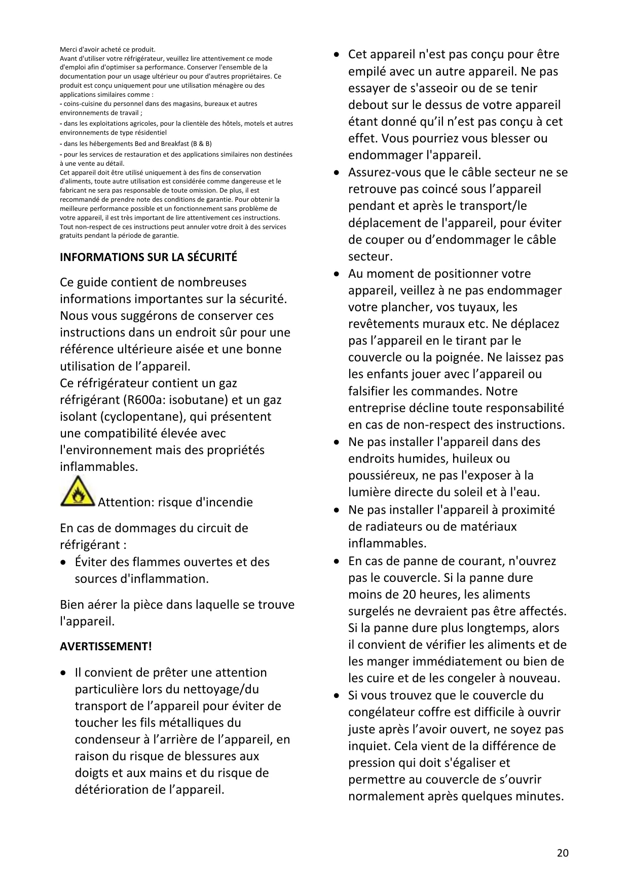 étant donné qu’il n’est pas conçu à cet effet. Vous pourriez vous blesser ou endommager l'appareil. • Assurez-vous que le câble secteur ne se retrouve pas coincé sous l’appareil pendant et après le transport/le déplacement de l'appareil, pour éviter de couper ou d’endommager le câble secteur. • Au moment de positionner votre appareil, veillez à ne pas endommager votre plancher, vos tuyaux, les revêtements muraux etc. Ne déplacez pas l’appareil en le tirant par le couvercle ou la poignée. Ne laissez pas les enfants jouer avec l’appareil ou falsifier les commandes. Notre entreprise décline toute responsabilité en cas de non-respect des instructions. • Ne pas installer l'appareil dans des endroits humides, huileux ou poussiéreux, ne pas l'exposer à la lumière directe du soleil et à l'eau. • Ne pas installer l'appareil à proximité de radiateurs ou de matériaux inflammables. • En cas de panne de courant, n'ouvrez pas le couvercle. Si la panne dure moins de 20 heures, les aliments surgelés ne devraient pas être affectés. Si la panne dure plus longtemps, alors il convient de vérifier les aliments et de les manger immédiatement ou bien de les cuire et de les congeler à nouveau. • Si vous trouvez que le couvercle du congélateur coffre est difficile à ouvrir juste après l’avoir ouvert, ne soyez pas inquiet. Cela vient de la différence de pression qui doit s'égaliser et permettre au couvercle de s’ouvrir normalement après quelques minutes.