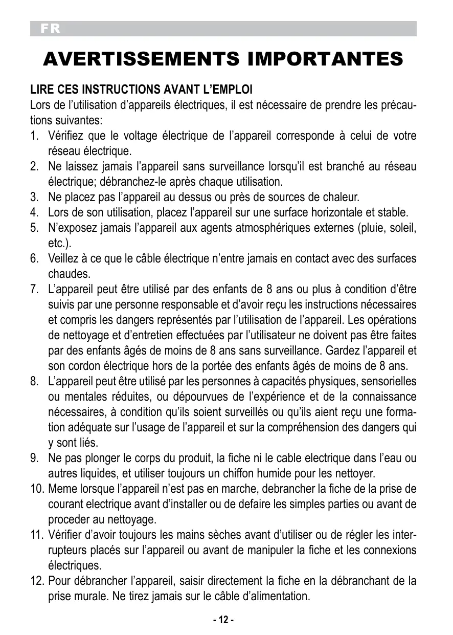 AVERTISSEMENTS IMPORTANTES LIRE CES INSTRUCTIONS AVANT L’EMPLOI Lors de l’utilisation d’appareils électriques, il est nécessaire de prendre les précautions suivantes: 1. Vérifiez que le voltage électrique de l’appareil corresponde à celui de votre réseau électrique. 2. Ne laissez jamais l’appareil sans surveillance lorsqu’il est branché au réseau électrique; débranchez-le après chaque utilisation. 3. Ne placez pas l’appareil au dessus ou près de sources de chaleur. 4. Lors de son utilisation, placez l’appareil sur une surface horizontale et stable. 5. N’exposez jamais l’appareil aux agents atmosphériques externes (pluie, soleil, etc.). 6. Veillez à ce que le câble électrique n’entre jamais en contact avec des surfaces chaudes. 7. L’appareil peut être utilisé par des enfants de 8 ans ou plus à condition d’être suivis par une personne responsable et d’avoir reçu les instructions nécessaires et compris les dangers représentés par l’utilisation de l’appareil. Les opérations de nettoyage et d’entretien effectuées par l’utilisateur ne doivent pas être faites par des enfants âgés de moins de 8 ans sans surveillance. Gardez l’appareil et son cordon électrique hors de la portée des enfants âgés de moins de 8 ans. 8. L’appareil peut être utilisé par les personnes à capacités physiques, sensorielles ou mentales réduites, ou dépourvues de l’expérience et de la connaissance nécessaires, à condition qu’ils soient surveillés ou qu’ils aient reçu une formation adéquate sur l’usage de l’appareil et sur la compréhension des dangers qui y sont liés. 9. Ne pas plonger le corps du produit, la fiche ni le cable electrique dans l’eau ou autres liquides, et utiliser toujours un chiffon humide pour les nettoyer. 10. Meme lorsque l’appareil n’est pas en marche, debrancher la fiche de la prise de courant electrique avant d’installer ou de defaire les simples parties ou avant de proceder au nettoyage. 11. Vérifier d’avoir toujours les mains sèches avant d’utiliser ou de régler les interrupteurs placés sur l’appareil ou avant de manipuler la fiche et les connexions électriques. 12. Pour débrancher l’appareil, saisir directement la fiche en la débranchant de la prise murale. Ne tirez jamais sur le câble d’alimentation. - 12 -