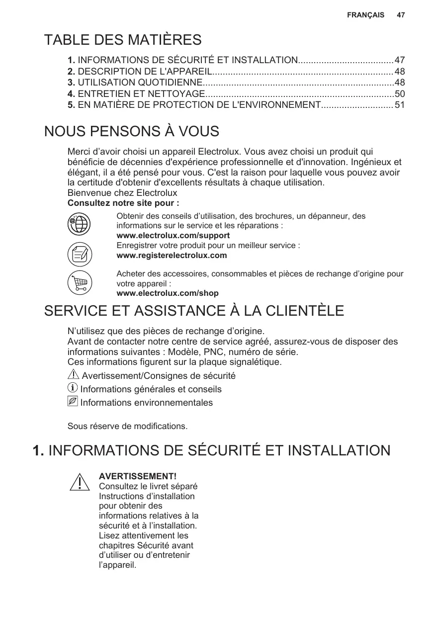 Merci d’avoir choisi un appareil Electrolux. Vous avez choisi un produit qui bénéficie de décennies d'expérience professionnelle et d'innovation. Ingénieux et élégant, il a été pensé pour vous. C'est la raison pour laquelle vous pouvez avoir la certitude d'obtenir d'excellents résultats à chaque utilisation. Bienvenue chez Electrolux Consultez notre site pour : Obtenir des conseils d’utilisation, des brochures, un dépanneur, des informations sur le service et les réparations : www.electrolux.com/support Enregistrer votre produit pour un meilleur service : www.registerelectrolux.com Acheter des accessoires, consommables et pièces de rechange d’origine pour votre appareil : www.electrolux.com/shop