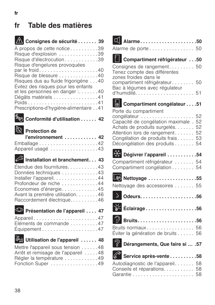 - Garantie Consignes de sécurité fr ( Consignes de sécurité Cet appareil est conforme aux dispositions de sécurité applicables aux appareils électriques et il est déparasité. Le circuit frigorifique a subi un contrôle d’étanchéité. p. 58