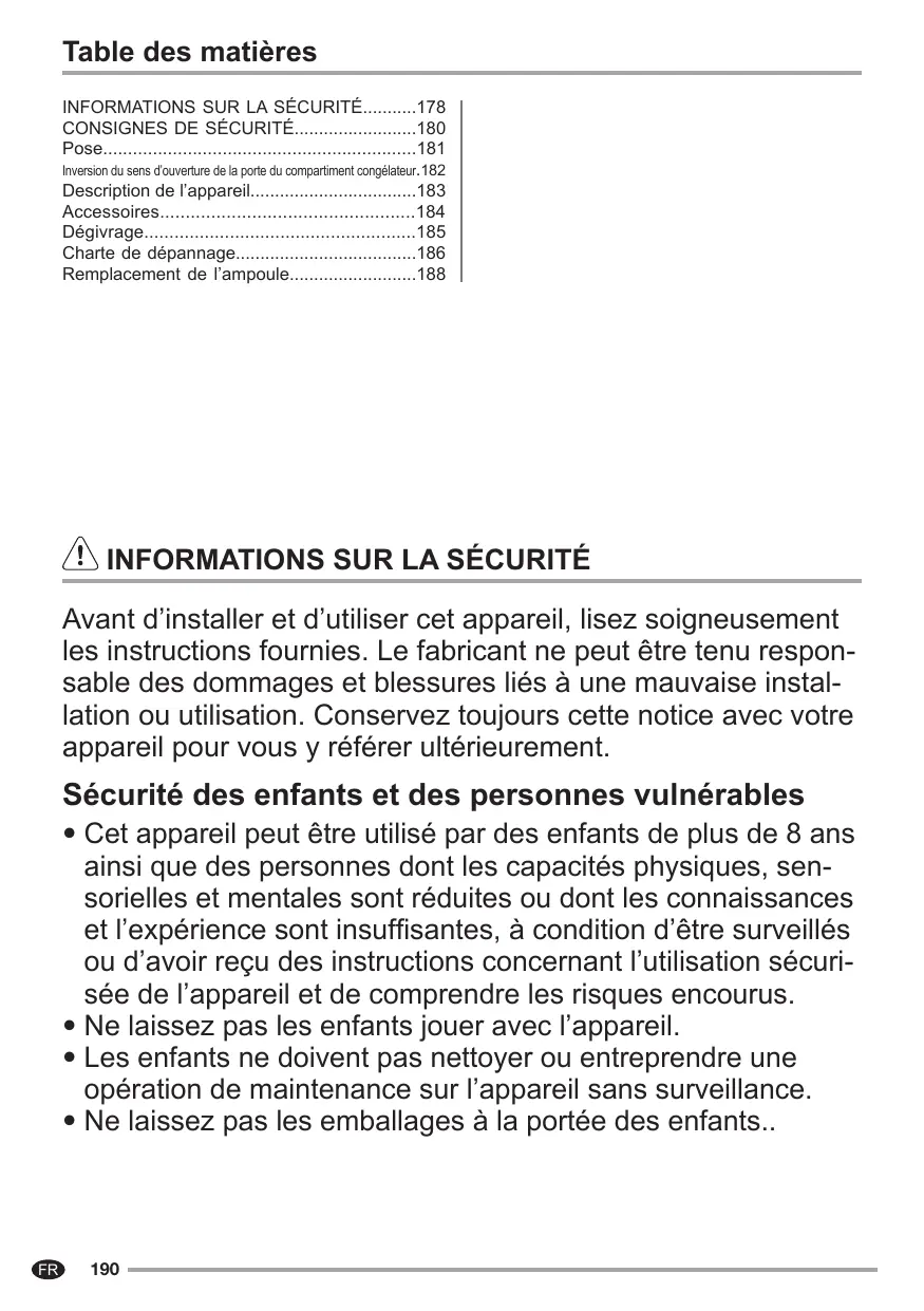 INFORMATIONS SUR LA SÉCURITÉ178 CONSIGNES DE SÉCURITÉ180 Pose181 Inversion du sens d’ouverture de la porte du compartiment congélateur.182 Description de l’appareil183 Accessoires184 Dégivrage185 Charte de dépannage186 Remplacement de l’ampoule188