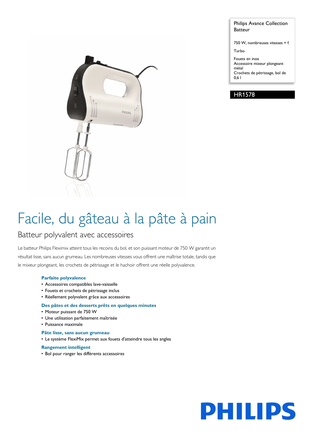 | Compatibilités | Compatible avec divers accessoires Philips HR1578 |