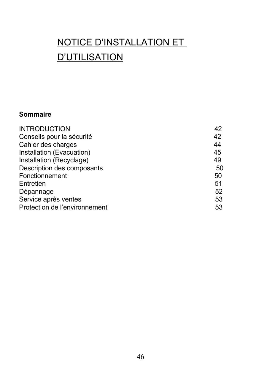 Sommaire INTRODUCTION Conseils pour la sécurité Cahier des charges Installation (Evacuation) Installation (Recyclage) Description des composants Fonctionnement Entretien Dépannage Service après ventes Protection de l’environnement
