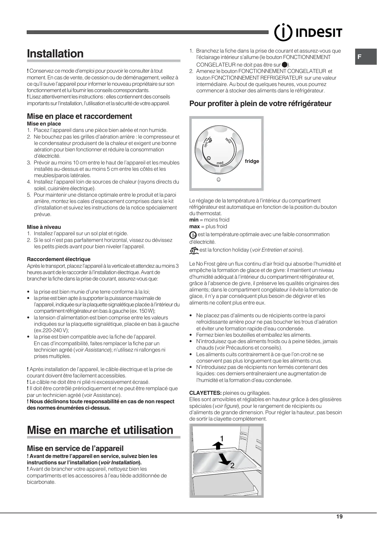Mise en place 1. Placez l’appareil dans une pièce bien aérée et non humide. 2. Ne bouchez pas les grilles d’aération arrière : le compresseur et le condensateur produisent de la chaleur et exigent une bonne aération pour bien fonctionner et réduire la consommation d’électricité. 3. Prévoir au moins 10 cm entre le haut de l’appareil et les meubles installés au-dessus et au moins 5 cm entre les côtés et les meubles/parois latérales. 4. Installez l’appareil loin de sources de chaleur (rayons directs du soleil, cuisinière électrique). 5. Pour maintenir une distance optimale entre le produit et la paroi arrière, montez les cales d’espacement comprises dans le kit d’installation et suivez les instructions de la notice spécialement prévue. Mise à niveau 1. Installez l’appareil sur un sol plat et rigide. 2. Si le sol n’est pas parfaitement horizontal, vissez ou dévissez les petits pieds avant pour bien niveler l’appareil. Raccordement électrique Après le transport, placez l’appareil à la verticale et attendez au moins 3 heures avant de le raccorder à l’installation électrique. Avant de brancher la fiche dans la prise de courant, assurez-vous que: • la prise est bien munie d’une terre conforme à la loi; • la prise est bien apte à supporter la puissance maximale de l’appareil, indiquée sur la plaquette signalétique placée à l’intérieur du compartiment réfrigérateur en bas à gauche (ex. 150 W); • la tension d’alimentation est bien comprise entre les valeurs indiquées sur la plaquette signalétique, placée en bas à gauche (ex.220-240 V); • la prise est bien compatible avec la fiche de l’appareil. En cas d’incompatibilité, faites remplacer la fiche par un technicien agréé (voir Assistance); n’utilisez ni rallonges ni prises multiples. ! Après installation de l’appareil, le câble électrique et la prise de courant doivent être facilement accessibles. ! Le câble ne doit être ni plié ni excessivement écrasé. ! Il doit être contrôlé prériodiquement et ne peut être remplacé que par un technicien agréé (voir Assistance). ! Nous déclinons toute responsabilité en cas de non respect des normes énumérées ci-dessus.