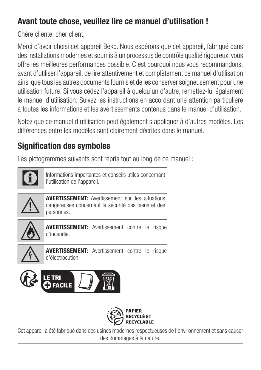 Avant toute chose, veuillez lire ce manuel d’utilisation ! Chère cliente, cher client, Merci d’avoir choisi cet appareil Beko. Nous espérons que cet appareil, fabriqué dans des installations modernes et soumis à un processus de contrôle qualité rigoureux, vous offre les meilleures performances possible. C’est pourquoi nous vous recommandons, avant d’utiliser l’appareil, de lire attentivement et complètement ce manuel d’utilisation ainsi que tous les autres documents fournis et de les conserver soigneusement pour une utilisation future. Si vous cédez l’appareil à quelqu’un d’autre, remettez-lui également le manuel d’utilisation. Suivez les instructions en accordant une attention particulière à toutes les informations et les avertissements contenus dans le manuel d’utilisation. Notez que ce manuel d’utilisation peut également s’appliquer à d’autres modèles. Les différences entre les modèles sont clairement décrites dans le manuel.