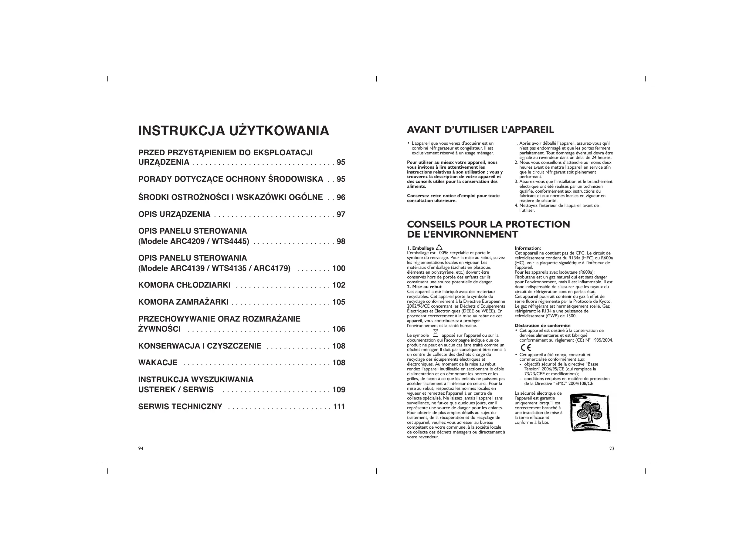 Cet appareil ne contient pas de CFC. Le circuit de refroidissement contient du R134a (HFC) ou R600a (HC), voir la plaquette signalétique à l’intérieur de l’appareil. Pour les appareils avec Isobutane (R600a): l’isobutane est un gaz naturel qui est sans danger pour l’environnement, mais il est inflammable. Il est donc indispensable de s’assurer que les tuyaux du circuit de réfrigération sont en parfait état. Cet appareil pourrait contenir du gaz à effet de serre fluoré réglementé par le Protocole de Kyoto. Le gaz réfrigérant est hermétiquement scellé. Gaz réfrigérant: le R134 a une puissance de refroidissement (GWP) de 1300. Déclaration de conformité • Cet appareil est destiné à la conservation de denrées alimentaires et est fabriqué conformément au règlement (CE) N° 1935/2004. • Cet appareil a été conçu, construit et commercialisé conformément aux: - objectifs sécurité de la directive “Basse Tension” 2006/95/CE (qui remplace la 73/23/CEE et modifications); - conditions requises en matière de protection de la Directive “EMC” 2004/108/CE. La sécurité électrique de l’appareil est garantie uniquement lorsqu’il est correctement branché à une installation de mise à la terre efficace et conforme à la Loi.