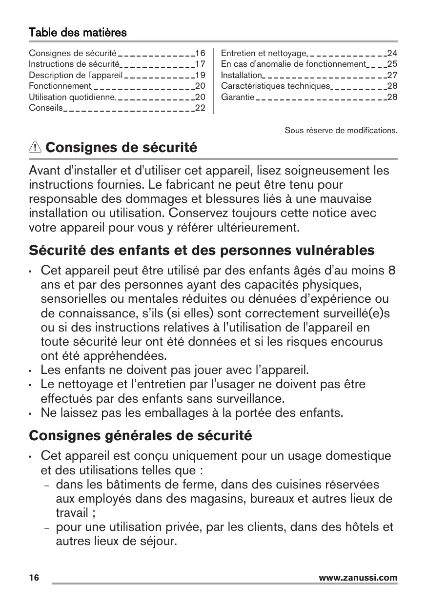 Cet appareil est conçu uniquement pour un usage domestique et des utilisations telles que : – dans les bâtiments de ferme, dans des cuisines réservées aux employés dans des magasins, bureaux et autres lieux de travail ; – pour une utilisation privée, par les clients, dans des hôtels et autres lieux de séjour. www.zanussi.com