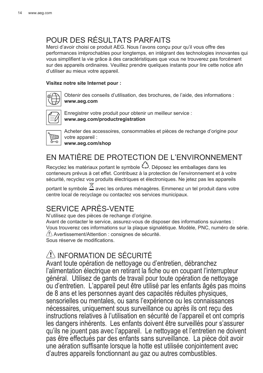 Merci d’avoir choisi ce produit AEG. Nous l’avons conçu pour qu’il vous offre des performances irréprochables pour longtemps, en intégrant des technologies innovantes qui vous simplifient la vie grâce à des caractéristiques que vous ne trouverez pas forcément sur des appareils ordinaires. Veuillez prendre quelques instants pour lire cette notice afin d’utiliser au mieux votre appareil. Visitez notre site Internet pour : Obtenir des conseils d’utilisation, des brochures, de l’aide, des informations : www.aeg.com Enregistrer votre produit pour obtenir un meilleur service : www.aeg.com/productregistration Acheter des accessoires, consommables et pièces de rechange d’origine pour votre appareil : www.aeg.com/shop
