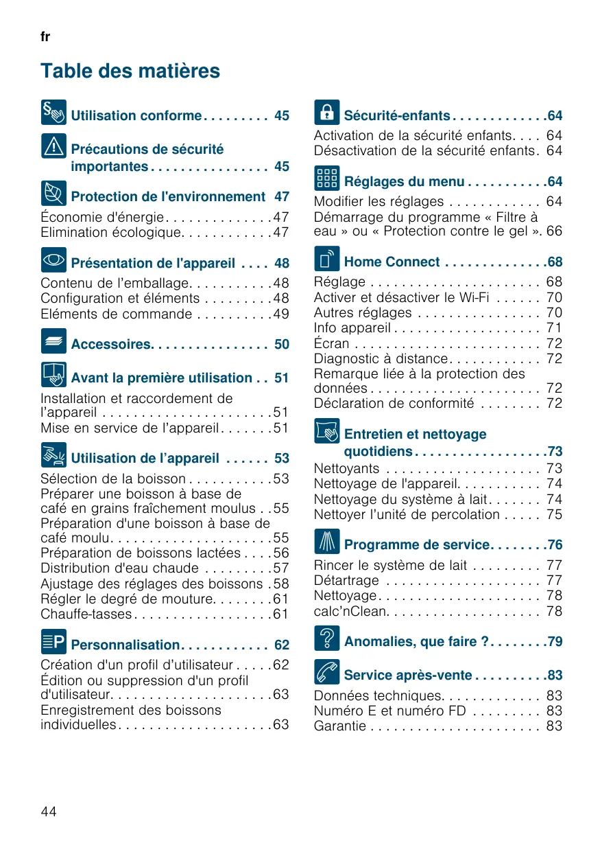 S'assurer que le système à conducteur de protection de l’installation électrique de la maison est conforme. Risque d’Ne électrocutionbrancher ! ■ et faire fonctionner l’appareil que conformément aux indications figurant sur la plaque signalétique. En cas d'endommagement du cordon d'alimentation secteur, celui-ci doit être remplacé par le service après-vente. ■ réparations de l’appareil sont réservées à notre service après-vente. Risque d’Ne électroniques sont priées de rester à 10 cm de l'appareil et des pièces suivantes, lors de leur retrait : réservoir à lait, système de lait, réservoir d'eau et unité de percolation.