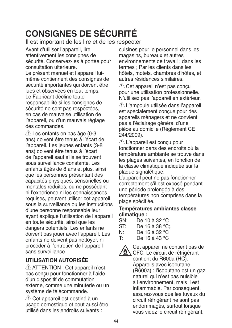 Cet appareil n’est pas conçu pour une utilisation professionnelle. N’utilisez pas l’appareil en extérieur. L’ampoule utilisée dans l’appareil est spécialement conçue pour des appareils ménagers et ne convient pas à l’éclairage général d’une pièce au domicile (Règlement CE 244/2009). L’appareil est conçu pour fonctionner dans des endroits où la température ambiante se trouve dans les plages suivantes, en fonction de la classe climatique indiquée sur la plaque signalétique. L’appareil peut ne pas fonctionner correctement s’il est exposé pendant une période prolongée à des températures non comprises dans la plage spécifiée. Températures ambiantes classe climatique : SN: De 10 à 32 °C ST: De 16 à 38 °C; N: De 16 à 32 °C T: De 16 à 43 °C Cet appareil ne contient pas de CFC. Le circuit de réfrigérant contient du R600a (HC). Appareils avec isobutane (R600a) : l’isobutane est un gaz naturel qui n’est pas nuisible à l’environnement, mais il est inflammable. Par conséquent, assurez-vous que les tuyaux du circuit réfrigérant ne sont pas endommagés, surtout lorsque vous videz le circuit réfrigérant.