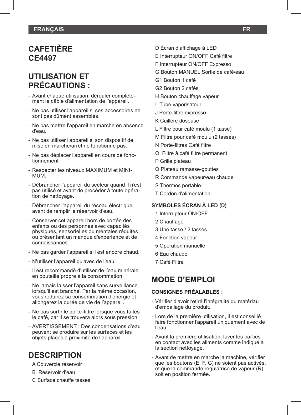 R Commande vapeur/eau chaude T Cordon d'alimentation SYMBOLES ÉCRAN À LED (D) 1 Interrupteur ON/OFF 2 Chauffage 3 Une tasse / 2 tasses 4 Fonction vapeur 5 Opération manuelle 6 Eau chaude 7 Café Filtre