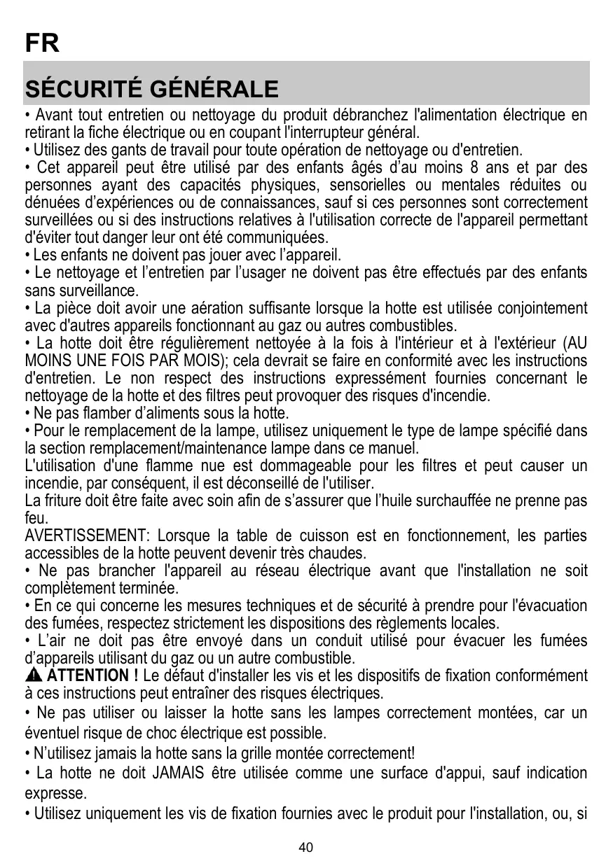 FR SÉCURITÉ GÉNÉRALE • Avant tout entretien ou nettoyage du produit débranchez l'alimentation électrique en retirant la fiche électrique ou en coupant l'interrupteur général. • Utilisez des gants de travail pour toute opération de nettoyage ou d'entretien. • Cet appareil peut être utilisé par des enfants âgés d’au moins 8 ans et par des personnes ayant des capacités physiques, sensorielles ou mentales réduites ou dénuées d’expériences ou de connaissances, sauf si ces personnes sont correctement surveillées ou si des instructions relatives à l'utilisation correcte de l'appareil permettant d'éviter tout danger leur ont été communiquées. • Les enfants ne doivent pas jouer avec l’appareil. • Le nettoyage et l’entretien par l’usager ne doivent pas être effectués par des enfants sans surveillance. • La pièce doit avoir une aération suffisante lorsque la hotte est utilisée conjointement avec d'autres appareils fonctionnant au gaz ou autres combustibles. • La hotte doit être régulièrement nettoyée à la fois à l'intérieur et à l'extérieur (AU MOINS UNE FOIS PAR MOIS); cela devrait se faire en conformité avec les instructions d'entretien. Le non respect des instructions expressément fournies concernant le nettoyage de la hotte et des filtres peut provoquer des risques d'incendie. • Ne pas flamber d’aliments sous la hotte. • Pour le remplacement de la lampe, utilisez uniquement le type de lampe spécifié dans la section remplacement/maintenance lampe dans ce manuel. L'utilisation d'une flamme nue est dommageable pour les filtres et peut causer un incendie, par conséquent, il est déconseillé de l'utiliser. La friture doit être faite avec soin afin de s’assurer que l’huile surchauffée ne prenne pas feu. AVERTISSEMENT: Lorsque la table de cuisson est en fonctionnement, les parties accessibles de la hotte peuvent devenir très chaudes. • Ne pas brancher l'appareil au réseau électrique avant que l'installation ne soit complètement terminée. • En ce qui concerne les mesures techniques et de sécurité à prendre pour l'évacuation des fumées, respectez strictement les dispositions des règlements locales. • L’air ne doit pas être envoyé dans un conduit utilisé pour évacuer les fumées d’appareils utilisant du gaz ou un autre combustible. ATTENTION ! Le défaut d'installer les vis et les dispositifs de fixation conformément à ces instructions peut entraîner des risques électriques. • Ne pas utiliser ou laisser la hotte sans les lampes correctement montées, car un éventuel risque de choc électrique est possible. • N’utilisez jamais la hotte sans la grille montée correctement! • La hotte ne doit JAMAIS être utilisée comme une surface d'appui, sauf indication expresse. • Utilisez uniquement les vis de fixation fournies avec le produit pour l'installation, ou, si 40