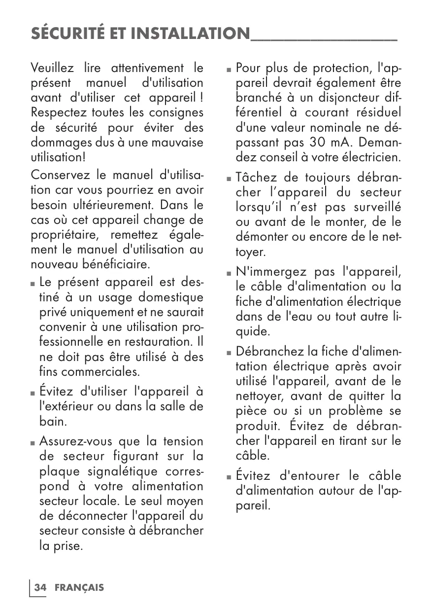 SÉCURITÉ ET INSTALLATION_______________________ Veuillez lire attentivement le présent manuel d'utilisation avant d'utiliser cet appareil ! Respectez toutes les consignes de sécurité pour éviter des dommages dus à une mauvaise utilisation! Conservez le manuel d'utilisation car vous pourriez en avoir besoin ultérieurement. Dans le cas où cet appareil change de propriétaire, remettez également le manuel d'utilisation au nouveau bénéficiaire. Le présent appareil est destiné à un usage domestique privé uniquement et ne saurait convenir à une utilisation professionnelle en restauration. Il ne doit pas être utilisé à des fins commerciales. Évitez d'utiliser l'appareil à l'extérieur ou dans la salle de bain. Assurez-vous que la tension de secteur figurant sur la plaque signalétique correspond à votre alimentation secteur locale. Le seul moyen de déconnecter l'appareil du secteur consiste à débrancher la prise.