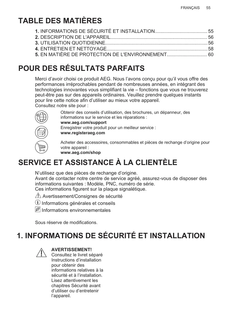 Enregistrer votre produit pour un meilleur service : www.registeraeg.com Acheter des accessoires, consommables et pièces de rechange d’origine pour votre appareil : www.aeg.com/shop