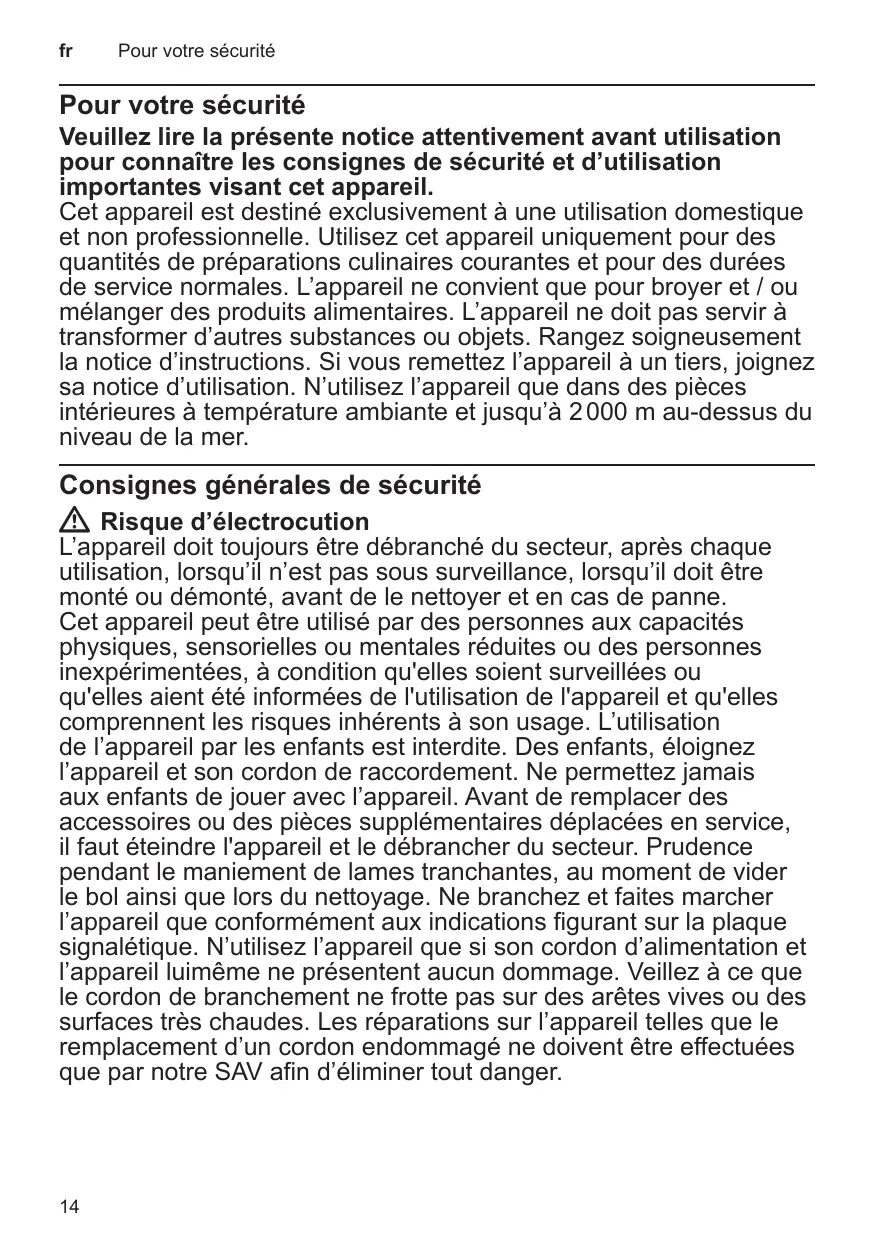 WW Risque d’électrocution L’appareil doit toujours être débranché du secteur, après chaque utilisation, lorsqu’il n’est pas sous surveillance, lorsqu’il doit être monté ou démonté, avant de le nettoyer et en cas de panne. Cet appareil peut être utilisé par des personnes aux capacités physiques, sensorielles ou mentales réduites ou des personnes inexpérimentées, à condition qu'elles soient surveillées ou qu'elles aient été informées de l'utilisation de l'appareil et qu'elles comprennent les risques inhérents à son usage. L’utilisation de l’appareil par les enfants est interdite. Des enfants, éloignez l’appareil et son cordon de raccordement. Ne permettez jamais aux enfants de jouer avec l’appareil. Avant de remplacer des accessoires ou des pièces supplémentaires déplacées en service, il faut éteindre l'appareil et le débrancher du secteur. Prudence pendant le maniement de lames tranchantes, au moment de vider le bol ainsi que lors du nettoyage. Ne branchez et faites marcher l’appareil que conformément aux indications figurant sur la plaque signalétique. N’utilisez l’appareil que si son cordon d’alimentation et l’appareil luimême ne présentent aucun dommage. Veillez à ce que le cordon de branchement ne frotte pas sur des arêtes vives ou des surfaces très chaudes. Les réparations sur l’appareil telles que le remplacement d’un cordon endommagé ne doivent être effectuées que par notre SAV afin d’éliminer tout danger.