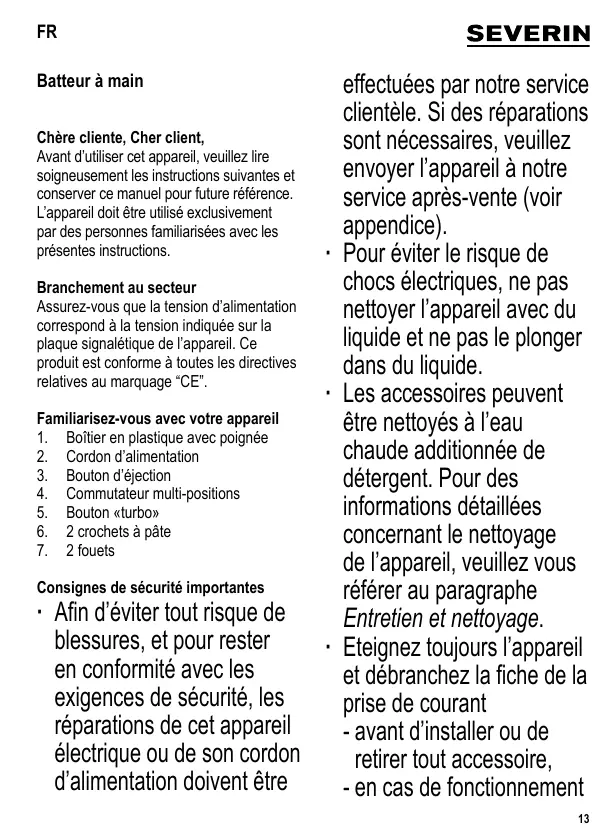 Chère cliente, Cher client, sont nécessaires, veuillez Avant d’utiliser cet appareil, veuillez lire envoyer l’appareil à notre soigneusement les instructions suivantes et conserver ce manuel pour future référence. service après-vente (voir L’appareil doit être utilisé exclusivement appendice). par des personnes familiarisées avec les présentes instructions. ∙ Pour éviter le risque de chocs électriques, ne pas Branchement au secteur Assurez-vous que la tension d’alimentation nettoyer l’appareil avec du correspond à la tension indiquée sur la liquide et ne pas le plonger plaque signalétique de l’appareil. Ce produit est conforme à toutes les directives dans du liquide. relatives au marquage “CE”. ∙ Les accessoires peuvent Familiarisez-vous avec votre appareil être nettoyés à l’eau 1. Boîtier en plastique avec poignée chaude additionnée de 2. Cordon d’alimentation 3. Bouton d’éjection détergent. Pour des 4. Commutateur multi-positions informations détaillées 5. Bouton «turbo» 6. 2 crochets à pâte concernant le nettoyage 7. 2 fouets de l’appareil, veuillez vous Consignes de sécurité importantes référer au paragraphe ∙ Afin d’éviter tout risque de Entretien et nettoyage. blessures, et pour rester ∙ Eteignez toujours l’appareil en conformité avec les et débranchez la fiche de la exigences de sécurité, les prise de courant réparations de cet appareil - avant d’installer ou de électrique ou de son cordon retirer tout accessoire, d’alimentation doivent être - en cas de fonctionnement Batteur à main