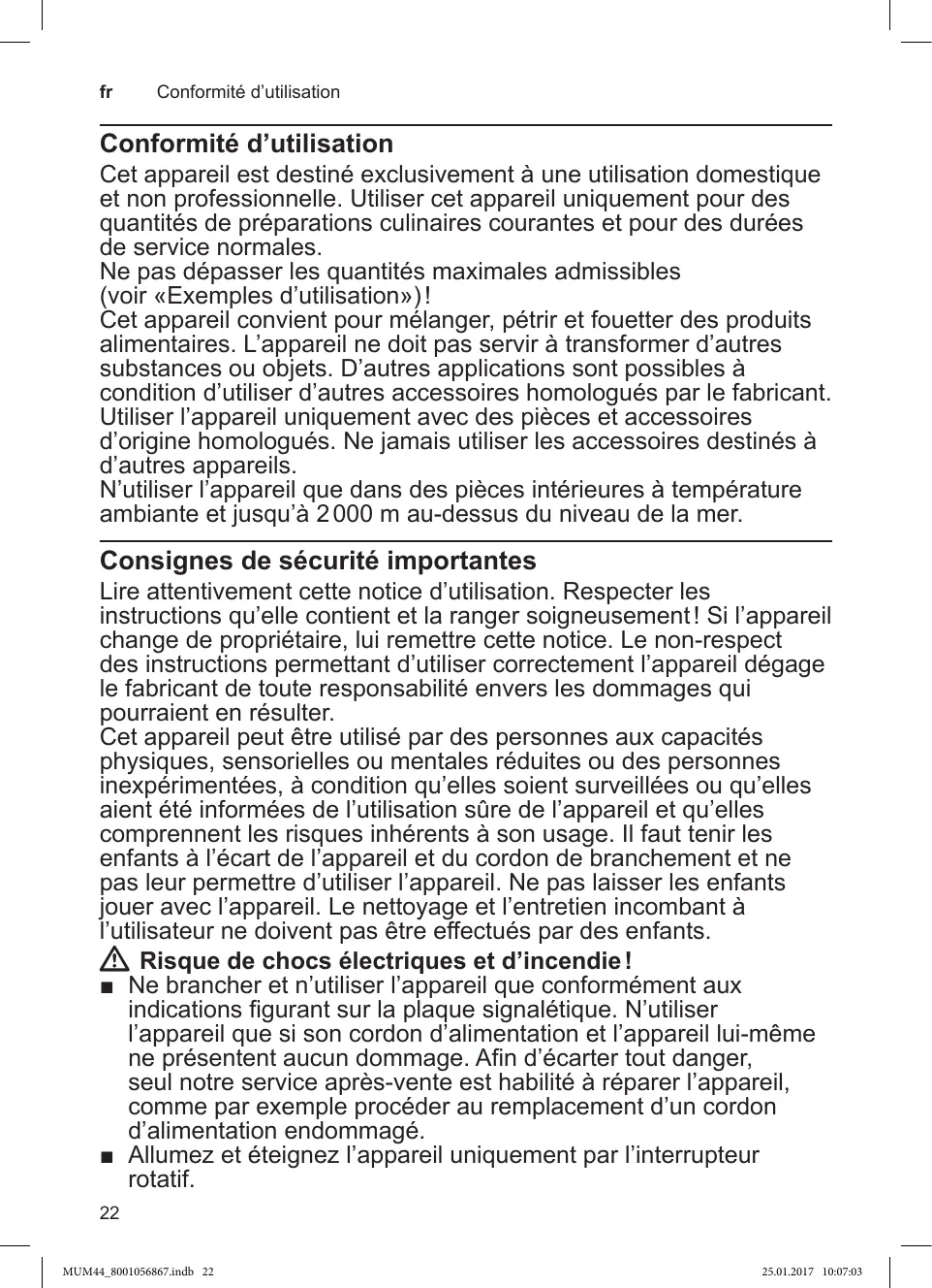 Cet appareil convient pour mélanger, pétrir et fouetter des produits alimentaires. L'appareil ne doit pas servir à transformer d’autres substances ou objets. D’autres applications sont possibles à condition d'utiliser d’autres accessoires homologués par le fabricant. Utiliser l'appareil uniquement avec des pièces et accessoires d’origine homologués. Ne jamais utiliser les accessoires destinés à d’autres appareils.