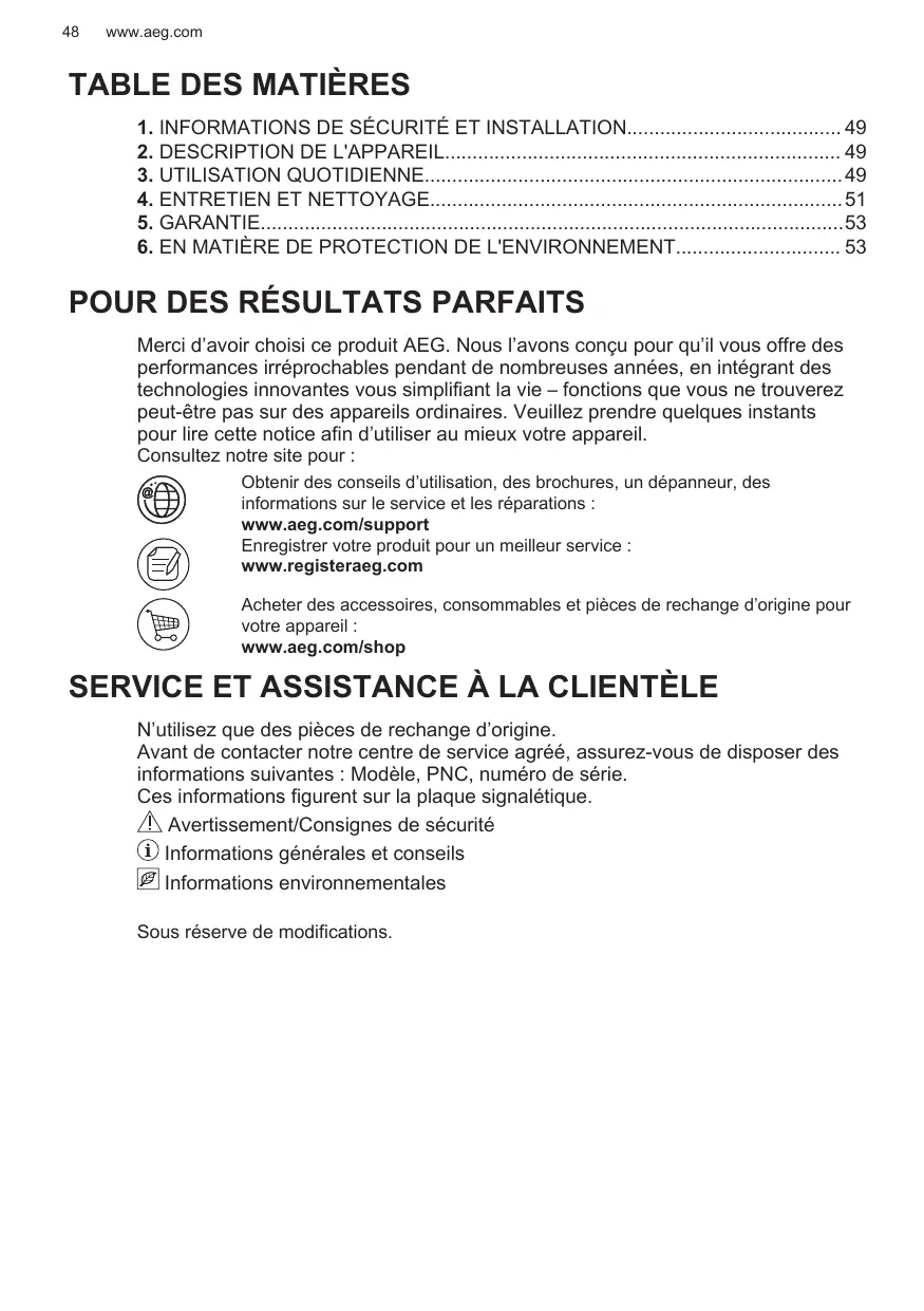 Avant de contacter notre centre de service agréé, assurez-vous de disposer des informations suivantes : Modèle, PNC, numéro de série. Ces informations figurent sur la plaque signalétique. Avertissement/Consignes de sécurité Informations générales et conseils Informations environnementales Sous réserve de modifications.