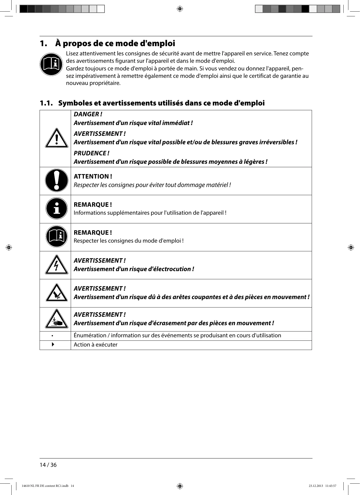 Lisez attentivement les consignes de sécurité avant de mettre l'appareil en service. Tenez compte des avertissements figurant sur l'appareil et dans le mode d'emploi. Gardez toujours ce mode d'emploi à portée de main. Si vous vendez ou donnez l'appareil, pensez impérativement à remettre également ce mode d'emploi ainsi que le certificat de garantie au nouveau propriétaire. 1.1. Symboles et avertissements utilisés dans ce mode d'emploi DANGER ! Avertissement d'un risque vital immédiat ! AVERTISSEMENT ! Avertissement d'un risque vital possible et/ou de blessures graves irréversibles ! PRUDENCE ! Avertissement d'un risque possible de blessures moyennes à légères ! ATTENTION ! Respecter les consignes pour éviter tout dommage matériel ! REMARQUE ! Informations supplémentaires pour l'utilisation de l'appareil ! REMARQUE ! Respecter les consignes du mode d'emploi ! AVERTISSEMENT ! Avertissement d'un risque d'électrocution ! AVERTISSEMENT ! Avertissement d'un risque dû à des arêtes coupantes et à des pièces en mouvement ! AVERTISSEMENT ! Avertissement d'un risque d'écrasement par des pièces en mouvement !