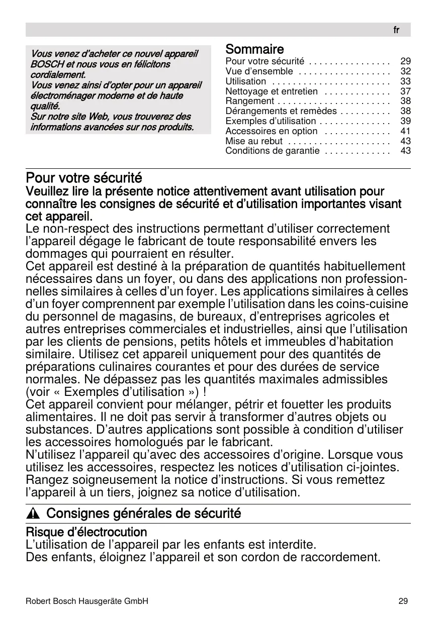 Pour votre sécurité Veuillez lire la présente notice attentivement avant utilisation pour connaître les consignes de sécurité et d’utilisation importantes visant cet appareil. Le non-respect des instructions permettant d’utiliser correctement l’appareil dégage le fabricant de toute responsabilité envers les dommages qui pourraient en résulter. Cet appareil est destiné à la préparation de quantités habituellement nécessaires dans un foyer, ou dans des applications non professionnelles similaires à celles d’un foyer. Les applications similaires à celles d’un foyer comprennent par exemple l’utilisation dans les coins-cuisine du personnel de magasins, de bureaux, d’entreprises agricoles et autres entreprises commerciales et industrielles, ainsi que l’utilisation par les clients de pensions, petits hôtels et immeubles d’habitation similaire. Utilisez cet appareil uniquement pour des quantités de préparations culinaires courantes et pour des durées de service normales. Ne dépassez pas les quantités maximales admissibles (voir « Exemples d’utilisation ») ! Cet appareil convient pour mélanger, pétrir et fouetter les produits alimentaires. Il ne doit pas servir à transformer d’autres objets ou substances. D’autres applications sont possible à condition d’utiliser les accessoires homologués par le fabricant. N’utilisez l’appareil qu’avec des accessoires d’origine. Lorsque vous utilisez les accessoires, respectez les notices d’utilisation ci-jointes. Rangez soigneusement la notice d’instructions. Si vous remettez l’appareil à un tiers, joignez sa notice d’utilisation. , Consignes générales de sécurité Risque d’électrocution L’utilisation de l’appareil par les enfants est interdite. Des enfants, éloignez l’appareil et son cordon de raccordement. Robert Bosch Hausgeräte GmbH