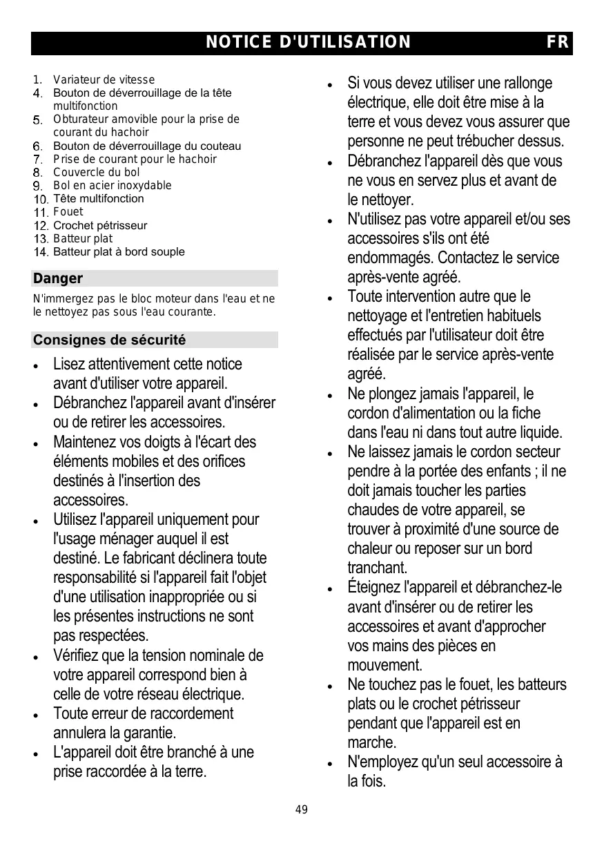N'utilisez pas votre appareil et/ou ses accessoires s'ils ont été endommagés. Contactez le service après-vente agréé. Toute intervention autre que le nettoyage et l'entretien habituels effectués par l'utilisateur doit être réalisée par le service après-vente agréé. Ne plongez jamais l'appareil, le cordon d'alimentation ou la fiche dans l'eau ni dans tout autre liquide. Ne laissez jamais le cordon secteur pendre à la portée des enfants ; il ne doit jamais toucher les parties chaudes de votre appareil, se trouver à proximité d'une source de chaleur ou reposer sur un bord tranchant. Éteignez l'appareil et débranchez-le avant d'insérer ou de retirer les accessoires et avant d'approcher vos mains des pièces en mouvement. Ne touchez pas le fouet, les batteurs plats ou le crochet pétrisseur pendant que l'appareil est en marche. N'employez qu'un seul accessoire à la fois.