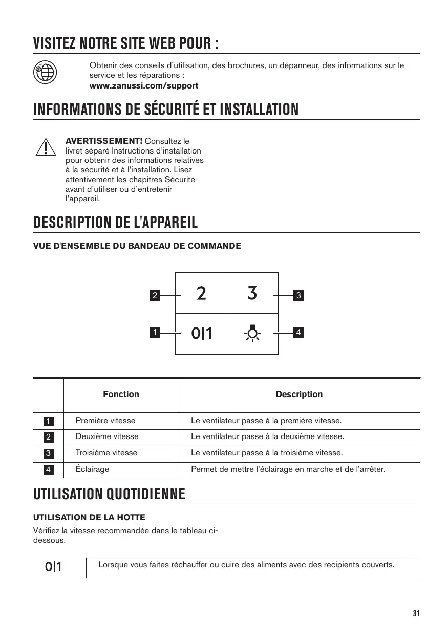 UTILISATION QUOTIDIENNE UTILISATION DE LA HOTTE Vérifiez la vitesse recommandée dans le tableau cidessous.