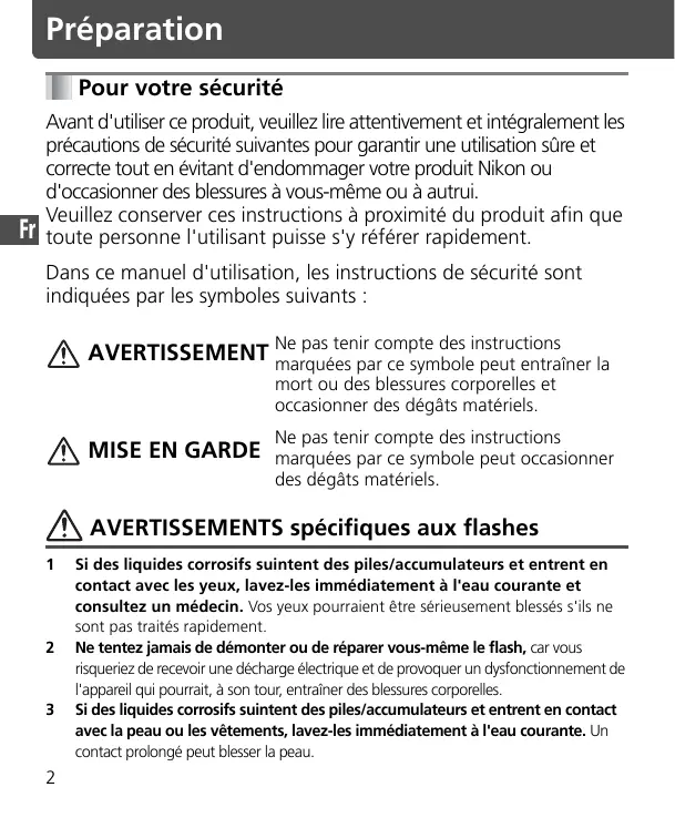 Avant d'utiliser ce produit, veuillez lire attentivement et intégralement les précautions de sécurité suivantes pour garantir une utilisation sûre et correcte tout en évitant d'endommager votre produit Nikon ou d'occasionner des blessures à vous-même ou à autrui.