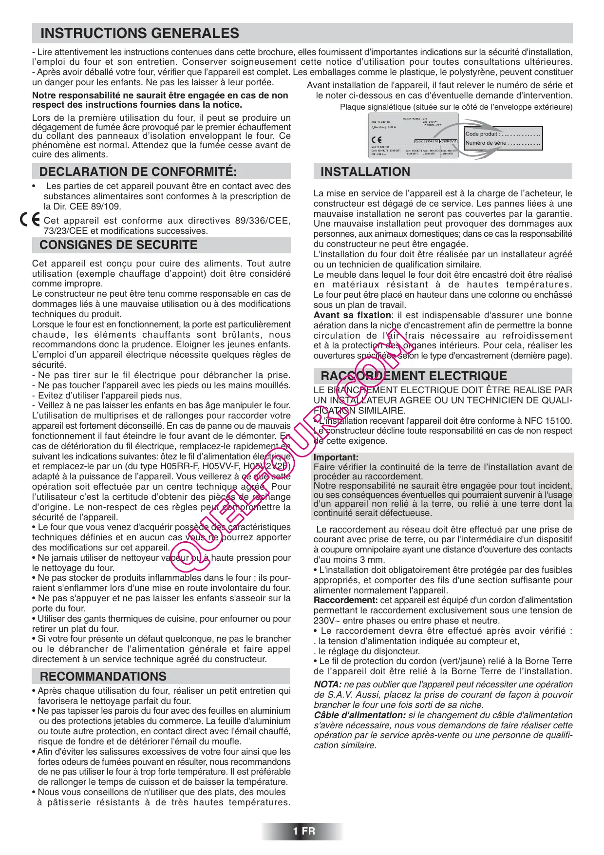 USER INSTRUCTIONS OVENS INSTRUCTIONS GENERALES - Lire attentivement les instructions contenues dans cette brochure, elles fournissent d’importantes indications sur la sécurité d’installation, l’emploi du four et son entretien. Conserver soigneusement cette notice d’utilisation pour toutes consultations ultérieures. - Après avoir déballé votre four, vérifier que l’appareil est complet. Les emballages comme le plastique, le polystyrène, peuvent constituer un danger pour les enfants. Ne pas les laisser à leur portée. Avant installation de l'appareil, il faut relever le numéro de série et Notre responsabilité ne saurait être engagée en cas de non le noter ci-dessous en cas d'éventuelle demande d'intervention. respect des instructions fournies dans la notice. Plaque signalétique (située sur le côté de l’enveloppe extérieure) Lors de la première utilisation du four, il peut se produire un dégagement de fumée âcre provoqué par le premier échauffement du collant des panneaux d’isolation enveloppant le four. Ce phénomène est normal. Attendez que la fumée cesse avant de cuire des aliments. DECLARATION DE CONFORMITÉ: