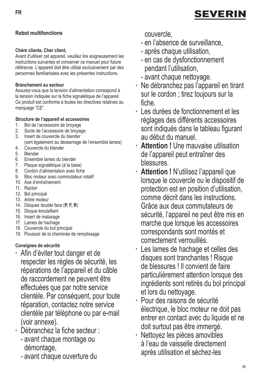 Chère cliente, Cher client, Avant d’utiliser cet appareil, veuillez lire soigneusement les instructions suivantes et conserver ce manuel pour future référence. L’appareil doit être utilisé exclusivement par des personnes familiarisées avec les présentes instructions. Branchement au secteur Assurez-vous que la tension d’alimentation correspond à la tension indiquée sur la fiche signalétique de l’appareil. Ce produit est conforme à toutes les directives relatives au marquage “CE”. Structure de l’appareil et accessoires 1. Bol de l’accessoire de broyage 2. Socle de l’accessoire de broyage 3. Insert de couvercle du blender (sert également au desserrage de l’ensemble lames) 4. Couvercle du blender 5. Blender 6. Ensemble lames du blender 7. Plaque signalétique (à la base) 8. Cordon d’alimentation avec fiche 9. Bloc moteur avec commutateur rotatif 10. Axe d’entraînement 11. Racloir 12. Bol principal 13. Arbre moteur 14. Disques double face (P, F, R) 15. Disque émulsifiant 16. Insert de malaxage 17. Lames de hachage 18. Couvercle du bol principal 19. Poussoir de la cheminée de remplissage Consignes de sécurité