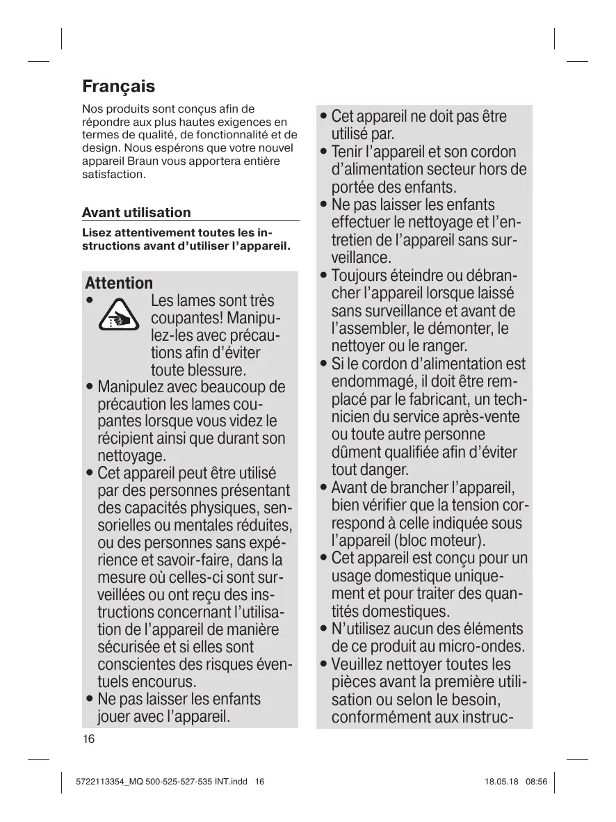 • Les lames sont très coupantes! Manipulez-les avec précautions afin d’éviter toute blessure. • Manipulez avec beaucoup de précaution les lames coupantes lorsque vous videz le récipient ainsi que durant son nettoyage. • Cet appareil peut être utilisé par des personnes présentant des capacités physiques, sensorielles ou mentales réduites, ou des personnes sans expérience et savoir-faire, dans la mesure où celles-ci sont surveillées ou ont reçu des instructions concernant l’utilisation de l’appareil de manière sécurisée et si elles sont conscientes des risques éventuels encourus. • Ne pas laisser les enfants jouer avec l’appareil.