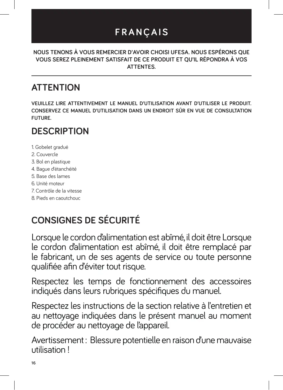 Lorsque le cordon d’alimentation est abîmé, il doit être Lorsque le cordon d’alimentation est abîmé, il doit être remplacé par le fabricant, un de ses agents de service ou toute personne qualifiée afin d’éviter tout risque. Respectez les temps de fonctionnement des accessoires indiqués dans leurs rubriques spécifiques du manuel. Respectez les instructions de la section relative à l’entretien et au nettoyage indiquées dans le présent manuel au moment de procéder au nettoyage de l’appareil. Avertissement : Blessure potentielle en raison d’une mauvaise utilisation ! 16