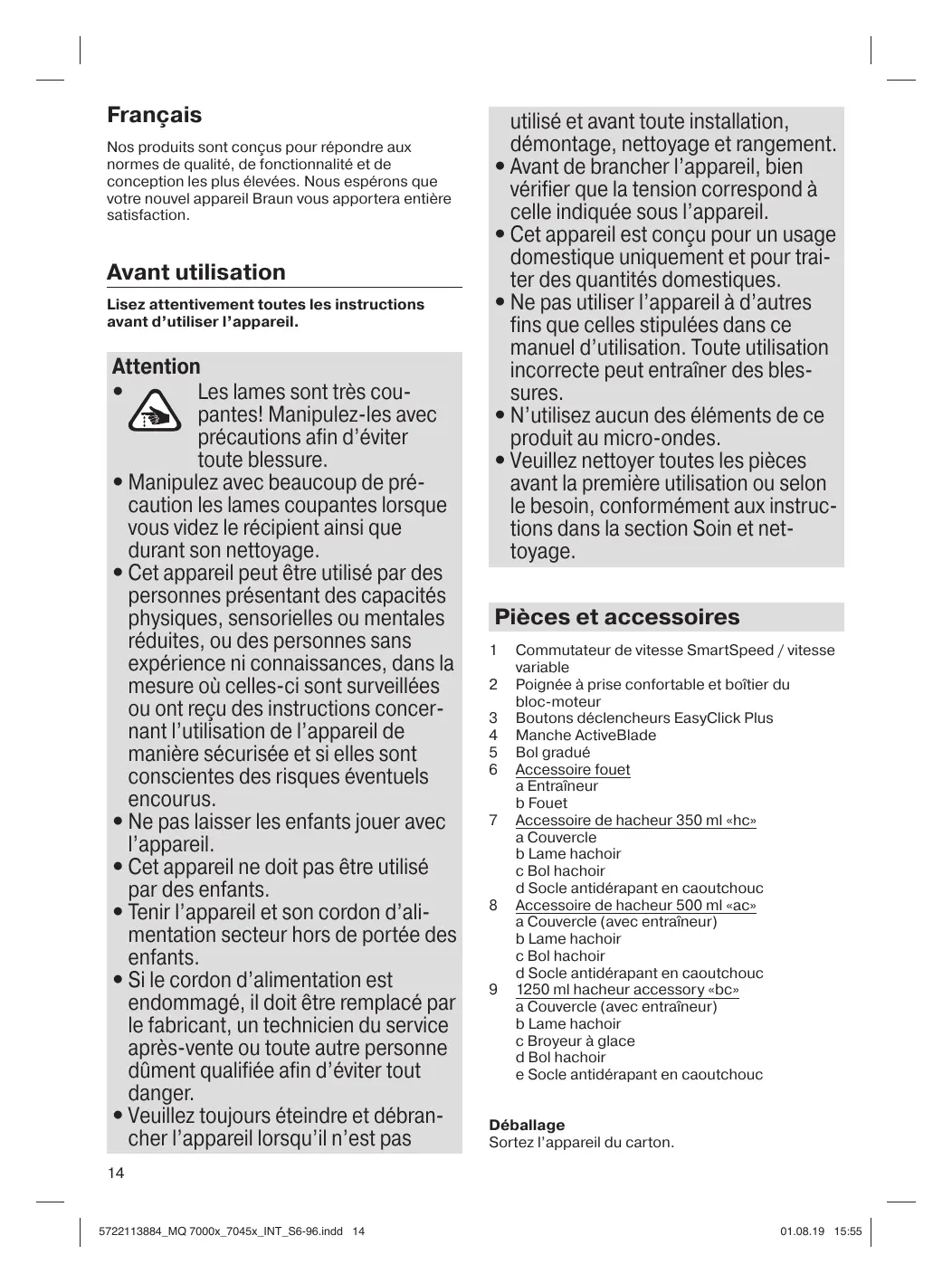 Les hacheurs (7/8/9) sont parfaitement adaptés pour hacher le fromage à pâte dure, les oignons, les herbes, l‘ail, les légumes, le pain, les biscuits et les noix. Utiliser le hachoir «hc» (7) pour des résultats parfaits. Il ne convient pas pour la viande. „Avec le hachoir « hc », ne remplir que jusqu’à la ligne max pour la quantité d’ingrédients. La durée de fonctionnement maximale du hachoir « hc » s’élève à: 1 minute pour les grandes quantités d’ingrédients humides, 30 secondes pour les ingrédients secs ou durs. REMARQUE: laisser un intervalle d’au moins 3 minutes avant de le remettre en marche (pour éviter les défaillances). Interrompre immédiatement l’opération en cas de diminution de la vitesse du moteur et/ou de fortes vibrations. Utiliser le hacheur «ca» et «bc» (8/9) pour des quantités plus importantes et pour la nourriture dure. De plus, le hacheur «bc» offre une variété d‘autres applications telles que les milkshakes, les boissons, les purées, les pâtes ou la glace pilée. Consulter le guide B – Préparation pour connaître les quantités maximales, les durées recommandées et les vitesses. Avant l’utilisation • Couper les aliments au préalable en petits morceaux pour qu’il soit plus facile de les hacher. • Enlever les os, les tendons et les nerfs de la viande pour éviter d’endommager les lames. • S’assurer que le socle antidérapant en caoutchouc (7d/8d/9e) est fixé sous le bol du hachoir. Assemblage et fonctionnement • Enlever avec précaution le protègelame en plastique. • Les lames (7b/8b/9b/9c) sont très aiguisées! Les tenir toujours au niveau de la partie supérieure en plastique et les manier avec prudence.