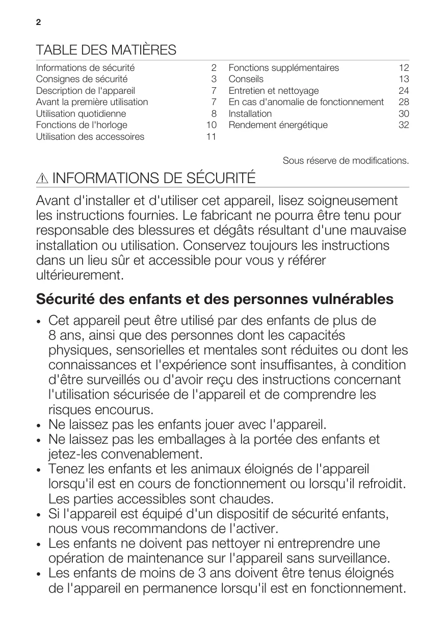 Cet appareil peut être utilisé par des enfants de plus de 8 ans, ainsi que des personnes dont les capacités physiques, sensorielles et mentales sont réduites ou dont les connaissances et l'expérience sont insuffisantes, à condition d'être surveillés ou d'avoir reçu des instructions concernant l'utilisation sécurisée de l'appareil et de comprendre les risques encourus. Ne laissez pas les enfants jouer avec l'appareil. Ne laissez pas les emballages à la portée des enfants et jetez-les convenablement. Tenez les enfants et les animaux éloignés de l'appareil lorsqu'il est en cours de fonctionnement ou lorsqu'il refroidit. Les parties accessibles sont chaudes. Si l'appareil est équipé d'un dispositif de sécurité enfants, nous vous recommandons de l'activer. Les enfants ne doivent pas nettoyer ni entreprendre une opération de maintenance sur l'appareil sans surveillance. Les enfants de moins de 3 ans doivent être tenus éloignés de l'appareil en permanence lorsqu'il est en fonctionnement.