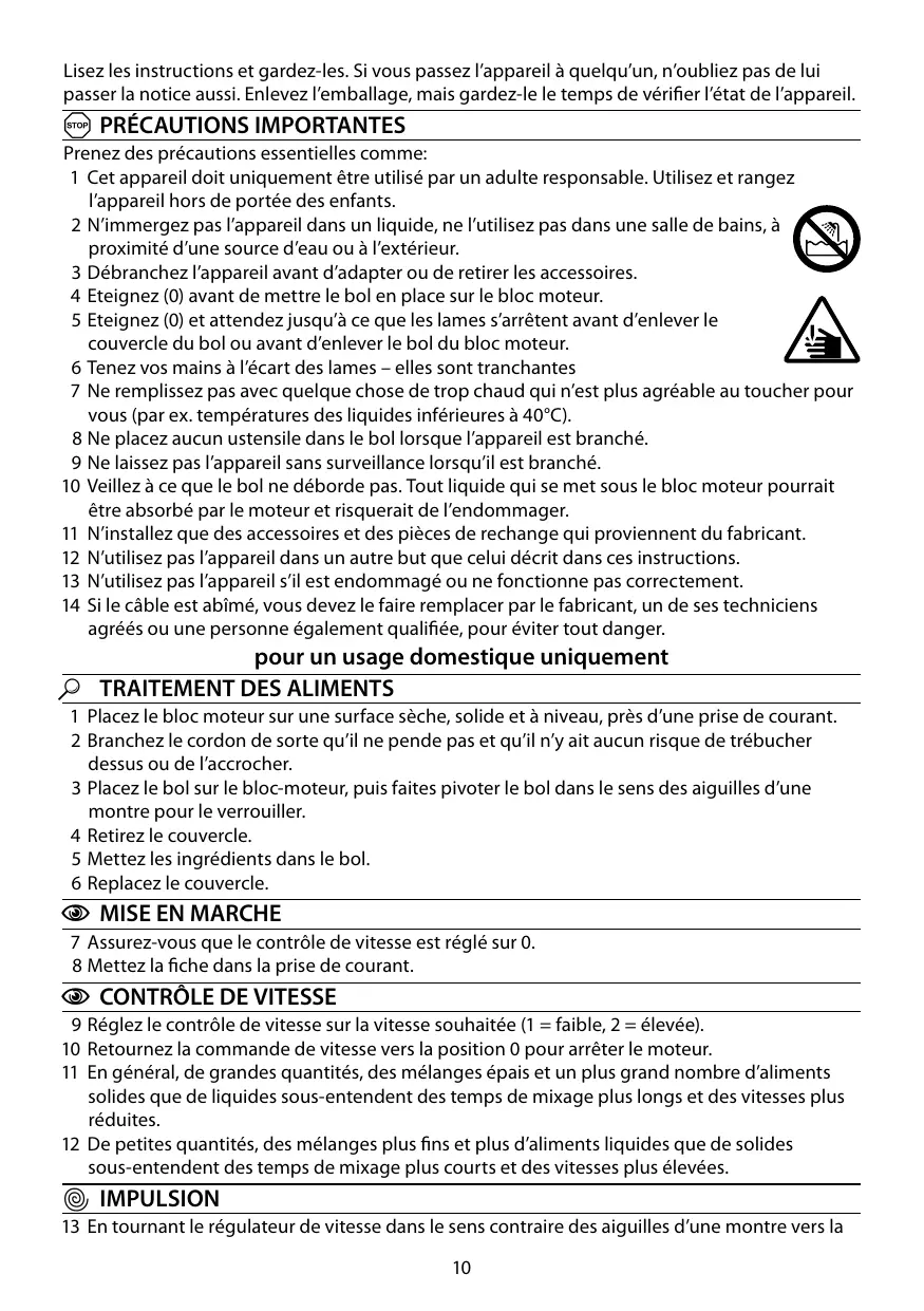 1 Cet appareil doit uniquement être utilisé par un adulte responsable. Utilisez et rangez l’appareil hors de portée des enfants. 2 N’immergez pas l’appareil dans un liquide, ne l’utilisez pas dans une salle de bains, à proximité d’une source d’eau ou à l’extérieur. 3 Débranchez l’appareil avant d’adapter ou de retirer les accessoires. 4 Eteignez (0) avant de mettre le bol en place sur le bloc moteur. 5 Eteignez (0) et attendez jusqu’à ce que les lames s’arrêtent avant d’enlever le couvercle du bol ou avant d’enlever le bol du bloc moteur. 6 Tenez vos mains à l’écart des lames – elles sont tranchantes 7 Ne remplissez pas avec quelque chose de trop chaud qui n’est plus agréable au toucher pour vous (par ex. températures des liquides inférieures à 40°C). 8 Ne placez aucun ustensile dans le bol lorsque l’appareil est branché. 9 Ne laissez pas l’appareil sans surveillance lorsqu’il est branché. 10 Veillez à ce que le bol ne déborde pas. Tout liquide qui se met sous le bloc moteur pourrait être absorbé par le moteur et risquerait de l’endommager. 11 N’installez que des accessoires et des pièces de rechange qui proviennent du fabricant. 12 N’utilisez pas l’appareil dans un autre but que celui décrit dans ces instructions. 13 N’utilisez pas l’appareil s’il est endommagé ou ne fonctionne pas correctement. 14 Si le câble est abîmé, vous devez le faire remplacer par le fabricant, un de ses techniciens agréés ou une personne également qualifiée, pour éviter tout danger.
