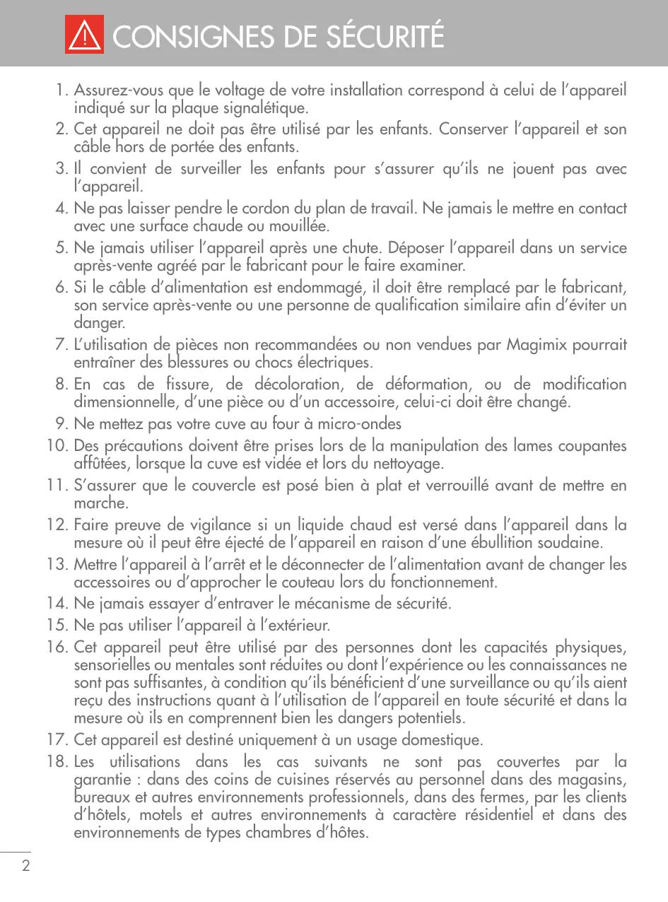 CONSIGNES DE SÉCURITÉ 01. Assurez-vous que le voltage de votre installation correspond à celui de l’appareil indiqué sur la plaque signalétique. 02. Cet appareil ne doit pas être utilisé par les enfants. Conserver l’appareil et son câble hors de portée des enfants. 03. Il convient de surveiller les enfants pour s’assurer qu’ils ne jouent pas avec l’appareil. 04. Ne pas laisser pendre le cordon du plan de travail. Ne jamais le mettre en contact avec une surface chaude ou mouillée. 05. Ne jamais utiliser l’appareil après une chute. Déposer l’appareil dans un service après-vente agréé par le fabricant pour le faire examiner. 06. Si le câble d’alimentation est endommagé, il doit être remplacé par le fabricant, son service après-vente ou une personne de qualification similaire afin d’éviter un danger. 07. L’utilisation de pièces non recommandées ou non vendues par Magimix pourrait entraîner des blessures ou chocs électriques. 08. En cas de fissure, de décoloration, de déformation, ou de modification dimensionnelle, d’une pièce ou d’un accessoire, celui-ci doit être changé. 09. Ne mettez pas votre cuve au four à micro-ondes 10. Des précautions doivent être prises lors de la manipulation des lames coupantes affûtées, lorsque la cuve est vidée et lors du nettoyage. 11. S’assurer que le couvercle est posé bien à plat et verrouillé avant de mettre en marche. 12. Faire preuve de vigilance si un liquide chaud est versé dans l’appareil dans la mesure où il peut être éjecté de l’appareil en raison d’une ébullition soudaine. 13. Mettre l’appareil à l’arrêt et le déconnecter de l’alimentation avant de changer les accessoires ou d’approcher le couteau lors du fonctionnement. 14. Ne jamais essayer d’entraver le mécanisme de sécurité. 15. Ne pas utiliser l’appareil à l’extérieur. 16. Cet appareil peut être utilisé par des personnes dont les capacités physiques, sensorielles ou mentales sont réduites ou dont l’expérience ou les connaissances ne sont pas suffisantes, à condition qu’ils bénéficient d’une surveillance ou qu’ils aient reçu des instructions quant à l’utilisation de l’appareil en toute sécurité et dans la mesure où ils en comprennent bien les dangers potentiels. 17. Cet appareil est destiné uniquement à un usage domestique. 18. Les utilisations dans les cas suivants ne sont pas couvertes par la garantie : dans des coins de cuisines réservés au personnel dans des magasins, bureaux et autres environnements professionnels, dans des fermes, par les clients d’hôtels, motels et autres environnements à caractère résidentiel et dans des environnements de types chambres d’hôtes. 2