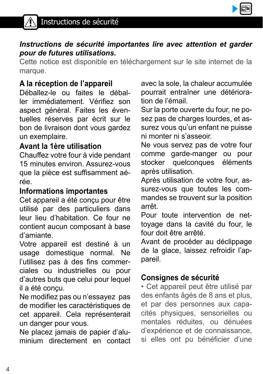 Instructions de sécurité Instructions de sécurité importantes lire avec attention et garder pour de futures utilisations. Cette notice est disponible en téléchargement sur le site internet de la marque. A la réception de l’appareil Déballez-le ou faites le déballer immédiatement. Vérifiez son aspect général. Faites les éventuelles réserves par écrit sur le bon de livraison dont vous gardez un exemplaire. Avant la 1ère utilisation Chauffez votre four à vide pendant 15 minutes environ. Assurez-vous que la pièce est suffisamment aérée. Informations importantes Cet appareil a été conçu pour être utilisé par des particuliers dans leur lieu d’habitation. Ce four ne contient aucun composant à base d’amiante. Votre appareil est destiné à un usage domestique normal. Ne l’utilisez pas à des fins commerciales ou industrielles ou pour d’autres buts que celui pour lequel il a été conçu. Ne modifiez pas ou n’essayez pas de modifier les caractéristiques de cet appareil. Cela représenterait un danger pour vous. Ne placez jamais de papier d’aluminium directement en contact