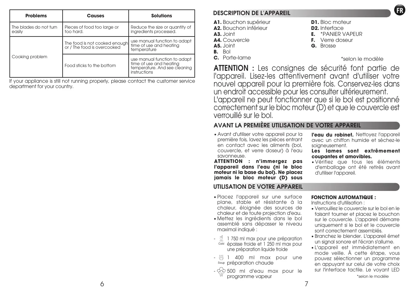 L'appareil ne peut fonctionner que si le bol est positionné correctement sur le bloc moteur (D) et que le couvercle est verrouillé sur le bol. AVANT LA PREMIÈRE UTILISATION DE VOTRE APPAREIL • Avant d'utiliser votre appareil pour la première fois, lavez les pièces entrant en contact avec les aliments (bol, couvercle, et verre doseur) à l'eau savonneuse. ATTENTION : n'immergez pas l'appareil dans l'eau (ni le bloc moteur ni la base du bol). Ne placez jamais le bloc moteur (D) sous