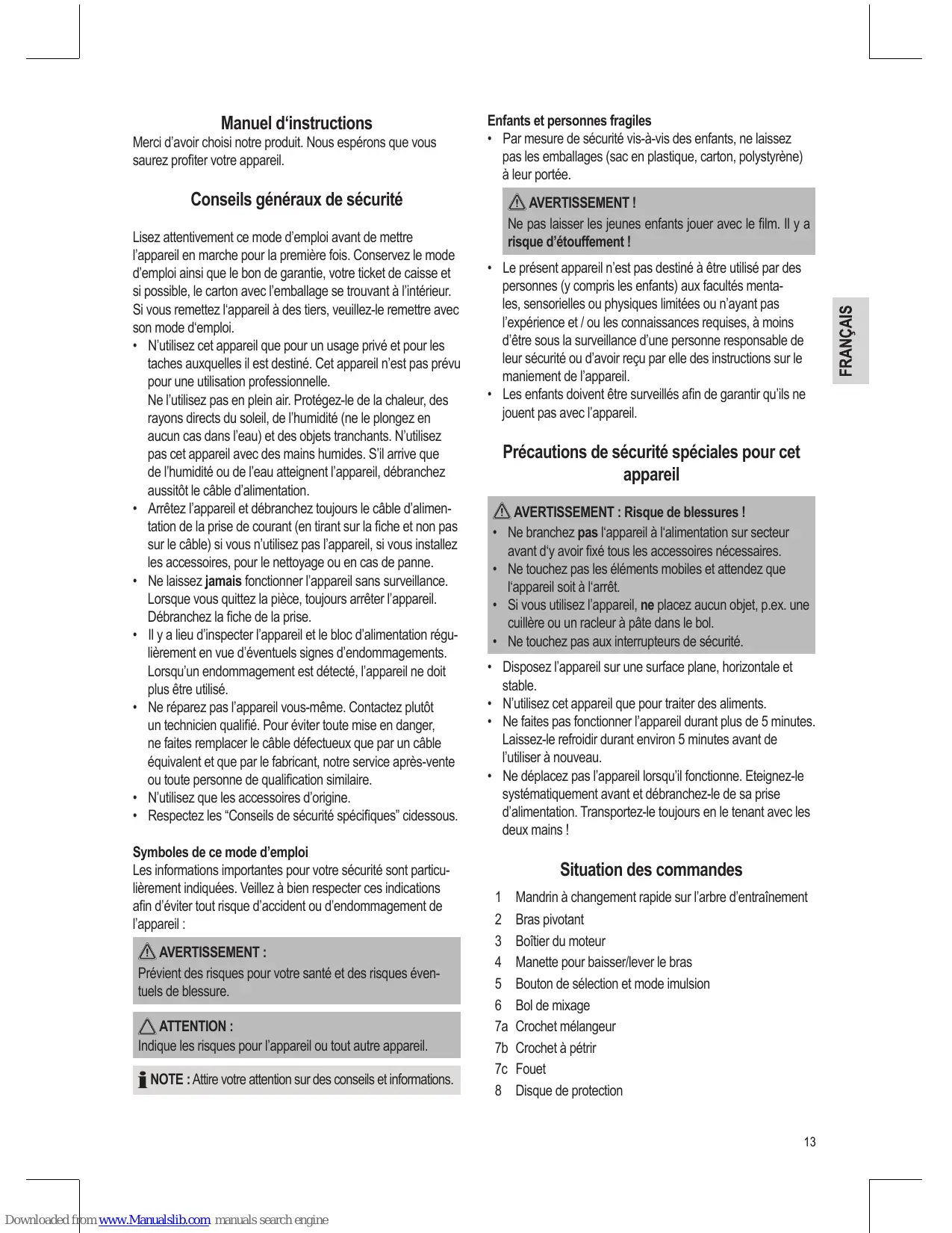 AVERTISSEMENT : Risque de blessures ! • Ne branchez pas l‘appareil à l‘alimentation sur secteur avant d‘y avoir fixé tous les accessoires nécessaires. • Ne touchez pas les éléments mobiles et attendez que l‘appareil soit à l‘arrêt. • Si vous utilisez l’appareil, ne placez aucun objet, p.ex. une cuillère ou un racleur à pâte dans le bol. • Ne touchez pas aux interrupteurs de sécurité. •• Disposez l’appareil sur une surface plane, horizontale et stable. •• N’utilisez cet appareil que pour traiter des aliments. •• Ne faites pas fonctionner l’appareil durant plus de 5 minutes. Laissez-le refroidir durant environ 5 minutes avant de l’utiliser à nouveau. •• Ne déplacez pas l’appareil lorsqu’il fonctionne. Eteignez-le systématiquement avant et débranchez-le de sa prise d’alimentation. Transportez-le toujours en le tenant avec les deux mains !