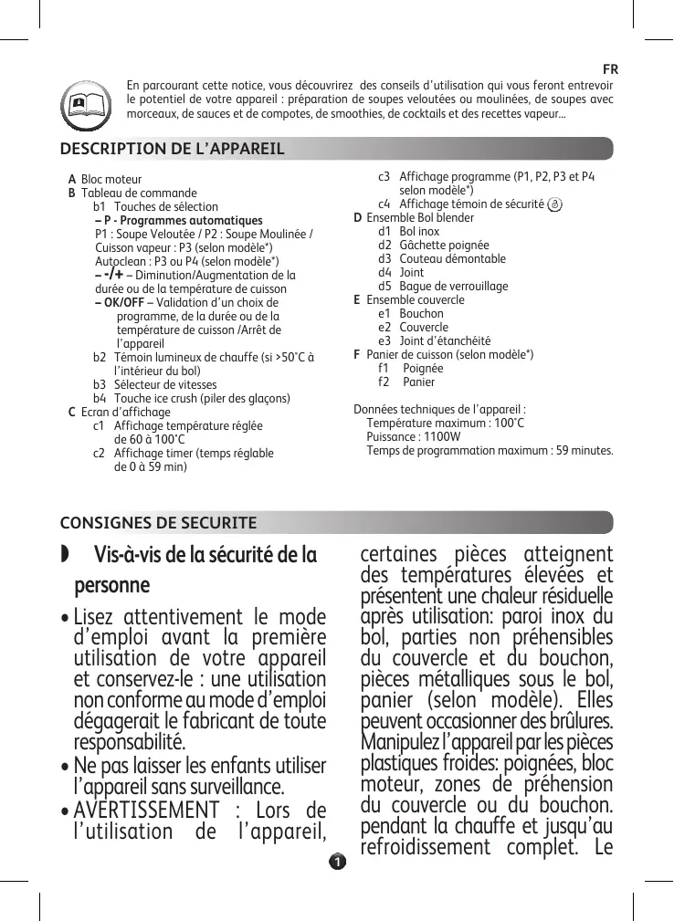 c3 Affichage programme (P1, P2, P3 et P4 selon modèle*) c4 Affichage témoin de sécurité D Ensemble Bol blender d1 Bol inox d2 Gâchette poignée d3 Couteau démontable d4 Joint d5 Bague de verrouillage E Ensemble couvercle e1 Bouchon e2 Couvercle e3 Joint d’étanchéité F Panier de cuisson (selon modèle*) f1 Poignée f2 Panier ASTART Bloc moteur B Tableau de commande b1 Touches de sélection – P - Programmes automatiques P1 : Soupe Veloutée / P2 : Soupe Moulinée / Cuisson vapeur : P3 (selon modèle*) Autoclean : P3 ou P4 (selon modèle*) – -/+ – Diminution/Augmentation de la durée ou de la température de cuisson – OK/OFF – Validation d’un choix de programme, de la durée ou de la température de cuisson /Arrêt de l’appareil b2 Témoin lumineux de chauffe (si >50°C à l’intérieur du bol) b3 Sélecteur de vitesses b4 Touche ice crush (piler des glaçons) C Ecran d’affichage c1 Affichage température réglée de 60 à 100°C c2 Affichage timer (temps réglable de 0 à 59 min) Vis-à-vis de la sécurité de la personne