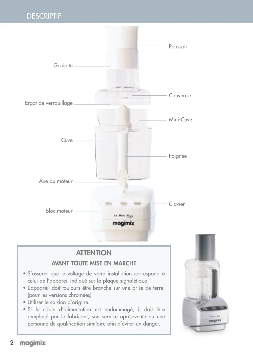 DESCRIPTIF Poussoir Goulotte Couvercle Ergot de verrouillage Mini-Cuve Cuve Poignée Axe du moteur Clavier Bloc moteur ATTENTION