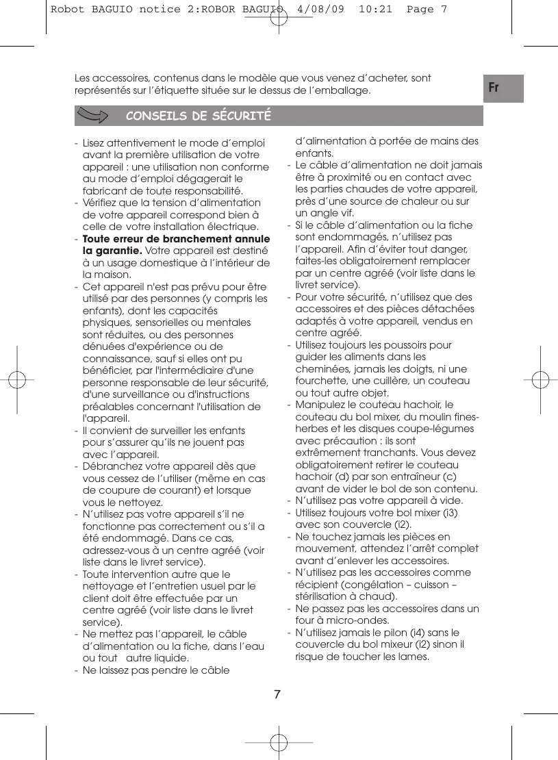 - Vérifiez que la tension d’alimentation de votre appareil correspond bien à celle de votre installation électrique. - Toute erreur de branchement annule la garantie. Votre appareil est destiné à un usage domestique à l’intérieur de la maison. - Cet appareil n'est pas prévu pour être utilisé par des personnes (y compris les enfants), dont les capacités physiques, sensorielles ou mentales sont réduites, ou des personnes dénuées d'expérience ou de connaissance, sauf si elles ont pu bénéficier, par l'intermédiaire d'une personne responsable de leur sécurité, d'une surveillance ou d'instructions préalables concernant l'utilisation de l'appareil. - Il convient de surveiller les enfants pour s’assurer qu’ils ne jouent pas avec l’appareil. - Débranchez votre appareil dès que vous cessez de l’utiliser (même en cas de coupure de courant) et lorsque vous le nettoyez. - N’utilisez pas votre appareil s’il ne fonctionne pas correctement ou s’il a été endommagé. Dans ce cas, adressez-vous à un centre agréé (voir liste dans le livret service). - Toute intervention autre que le nettoyage et l’entretien usuel par le client doit être effectuée par un centre agréé (voir liste dans le livret service). - Ne mettez pas l’appareil, le câble d’alimentation ou la fiche, dans l’eau ou tout autre liquide. - Ne laissez pas pendre le câble