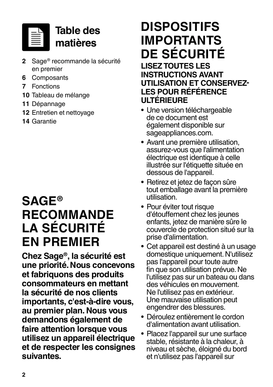 Chez Sage®, la sécurité est une priorité. Nous conscienceurs et fabriquons des produits consommateurs en mettant la sécurité de nos clients importants, c'est-à-dire vous, au premier plan. Nous vous demandons également de faire attention lorsque vous utilisez un apparil électrique et de respecter les consignes suivantes.