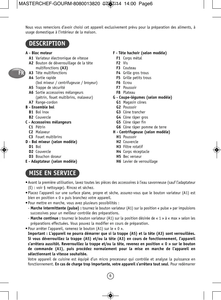 MASTERCHEF-GOURM-8080013820 07/07/14 14:00 Page6 Nous vous remercions d’avoir choisi cet appareil exclusivement prévu pour la préparation des aliments, à usage domestique à l’intérieur de la maison. DESCRIPTION