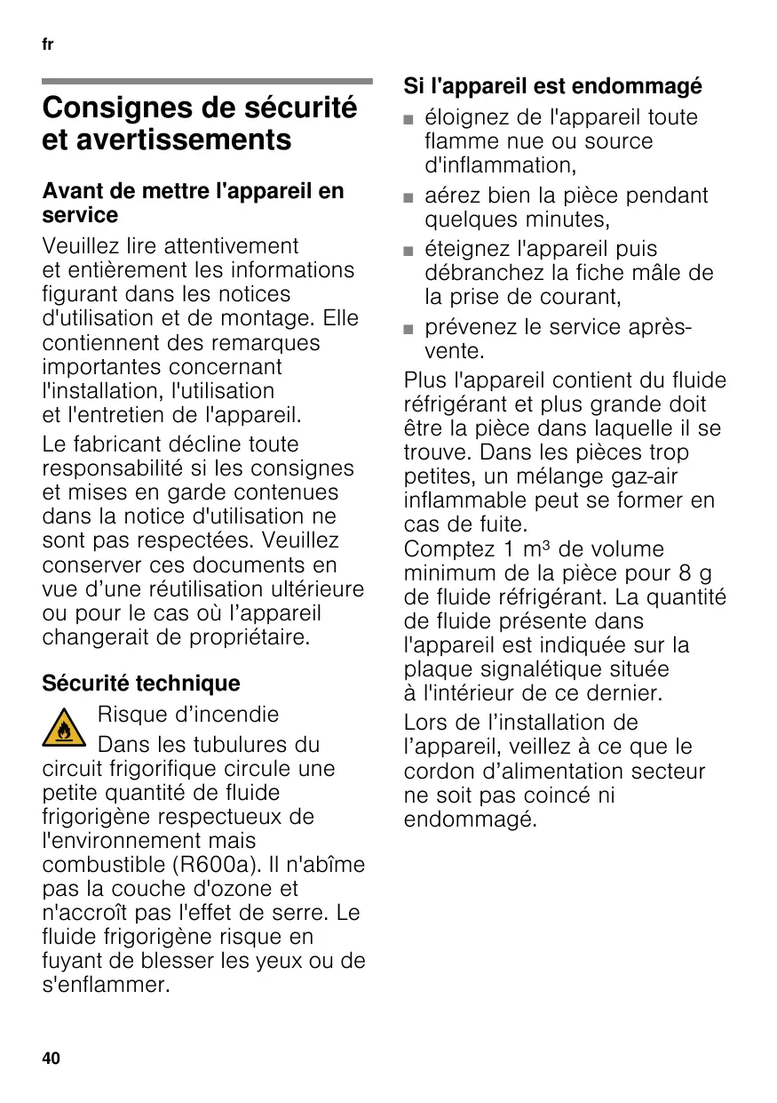 frTable des matièresfrMode d’emploi Consignes de sécurité et avertissements Avant de mettre l'appareil en service Veuillez lire attentivement et entièrement les informations figurant dans les notices d'utilisation et de montage. Elle contiennent des remarques importantes concernant l'installation, l'utilisation et l'entretien de l'appareil. Le fabricant décline toute responsabilité si les consignes et mises en garde contenues dans la notice d'utilisation ne sont pas respectées. Veuillez conserver ces documents en vue d’une réutilisation ultérieure ou pour le cas où l’appareil changerait de propriétaire. Sécurité technique Risque d’incendie Dans les tubulures du circuit frigorifique circule une petite quantité de fluide frigorigène respectueux de l'environnement mais combustible (R600a). Il n'abîme pas la couche d'ozone et n'accroît pas l'effet de serre. Le fluide frigorigène risque en fuyant de blesser les yeux ou de s'enflammer.